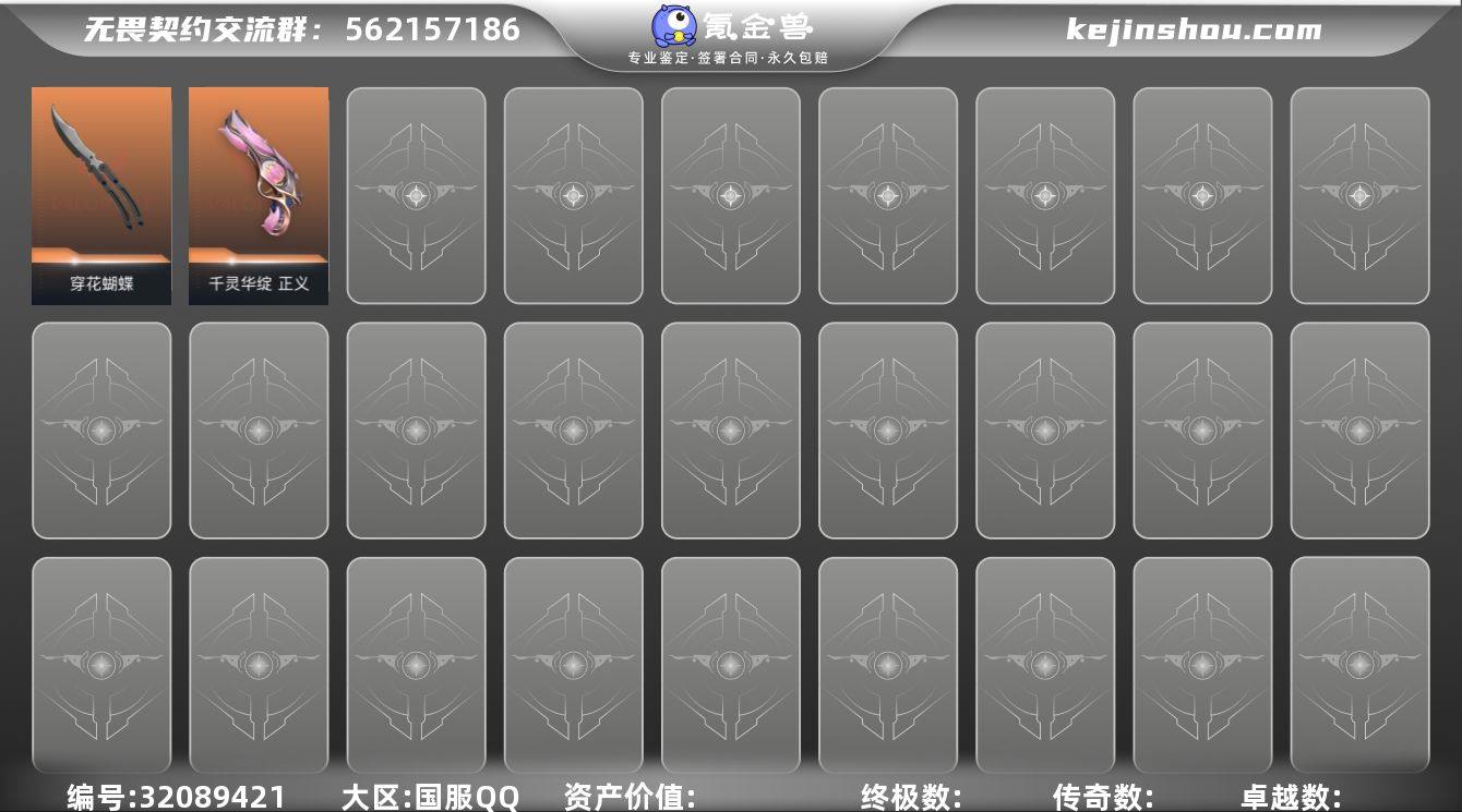 MWW586【游戏等级】Lv38 【段位】 黄金I 【R点】160 【皮肤总价值】5,460 【英雄数量】11 【皮肤数量】4 【挂饰数量】10 【卡面数量】15 【喷漆数量】10 【正义】正义-千灵华绽 【狂怒】狂怒-蒙太奇 【近战武器】近战武器-穿花蝴蝶 【狂徒】狂徒-盖亚的复仇