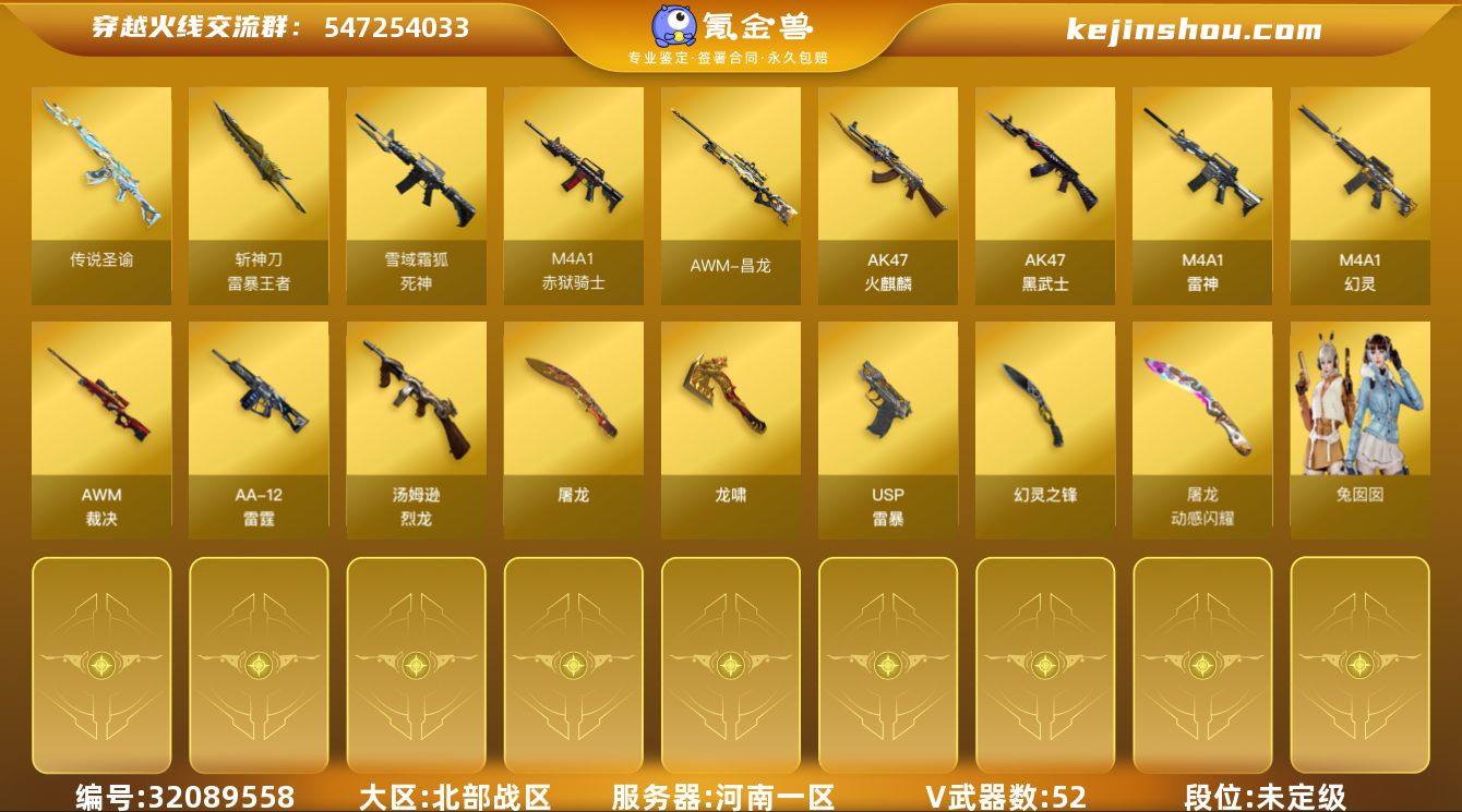 河南一区-56V-6王者-0炫金 【传说武器】:传说圣谕 【传说角色】:传说星骇 【热门武器】:传说圣谕,死亡之眼,汤姆逊-烈龙*5,USP-雷暴,柯尔特-赛博朋克 【王者炫金武器】:AK47-雷暴王者,王者森力,王者玉锋,斩神刀-雷暴王者 【音效卡】:AWM-裁决音效卡,Barrett-碧霄极光音效卡,炼狱-百战金芒-庆典舞曲音效卡,死神-雪域霜狐-怀旧音效卡,柯尔特-百战金芒-庆典舞曲音效卡 【皮肤】:裁决-叶芒苍灵 皮肤,雷神-宇航兔皮肤,M4A1-再燃火线,屠龙-春桃 皮肤,龙啸-纸灯龙皮肤,轻型军用手斧-再燃火线 【角色】:玄豹,战地猎狐,雪域霜狐,风暴女,龙儿,龙儿-小淘气,玫瑰花神,潘多拉-X,斯沃特-X,铁骑荣耀,兔囡囡 【人偶武器】:迷你钢铁终结者,异变清道夫-蛇影双骄,AWM-灵狐-15周年嘉年华,生化手雷-机甲核心 【暴走生化】:死亡之眼 【英雄级武器】:AK47-火麒麟,M4A1-雷神,AK47-黑武士,M4A1-幻灵,死神-雪域霜狐,SCAR Light-玄豹,王者猎神-觉醒版,AWM-裁决,王者之光-觉醒版,炼狱-百战金芒,汤姆逊-烈龙*5,AA-12-雷霆,USP-雷暴,Anaconda-玄豹,USP-冥王*2,屠龙,龙啸,幻灵之锋*2,麒麟刺-百战金芒,丛林匕首-玄豹,高爆手雷-幻灵*2,高爆手雷-玄豹*5,闪光弹-幻灵*2,闪光弹-玄豹*5,烟雾弹-幻灵*2,烟雾弹-玄豹*5,M4A1-赤狱骑士,M4A1-苍鸣雷神,AWM-昌龙,Barrett-碧霄极光 【道具】:BS战队炫彩背包,云山科技背包,亚洲杯纪念炫彩背包,炫彩背包-诺拉,百战金芒炫彩背包,雪域霜狐炫彩背包,圣拳猎手-炽雪,女皇终结者-魔龙之吻,救世主-黑桃战神,黄金生化钩,绿色巨人,灵魂忍者*2,变异宝贝,妖姬,迷雾幽灵,夺命之镰,防化服*3,金色流光-枪王排位,星辰流光-枪王排位,流光-鎏金之域,流光-再燃火线,枪王排位28赛季金色流光,枪王排位29赛季金色流光,语音特效-盛典烟火...