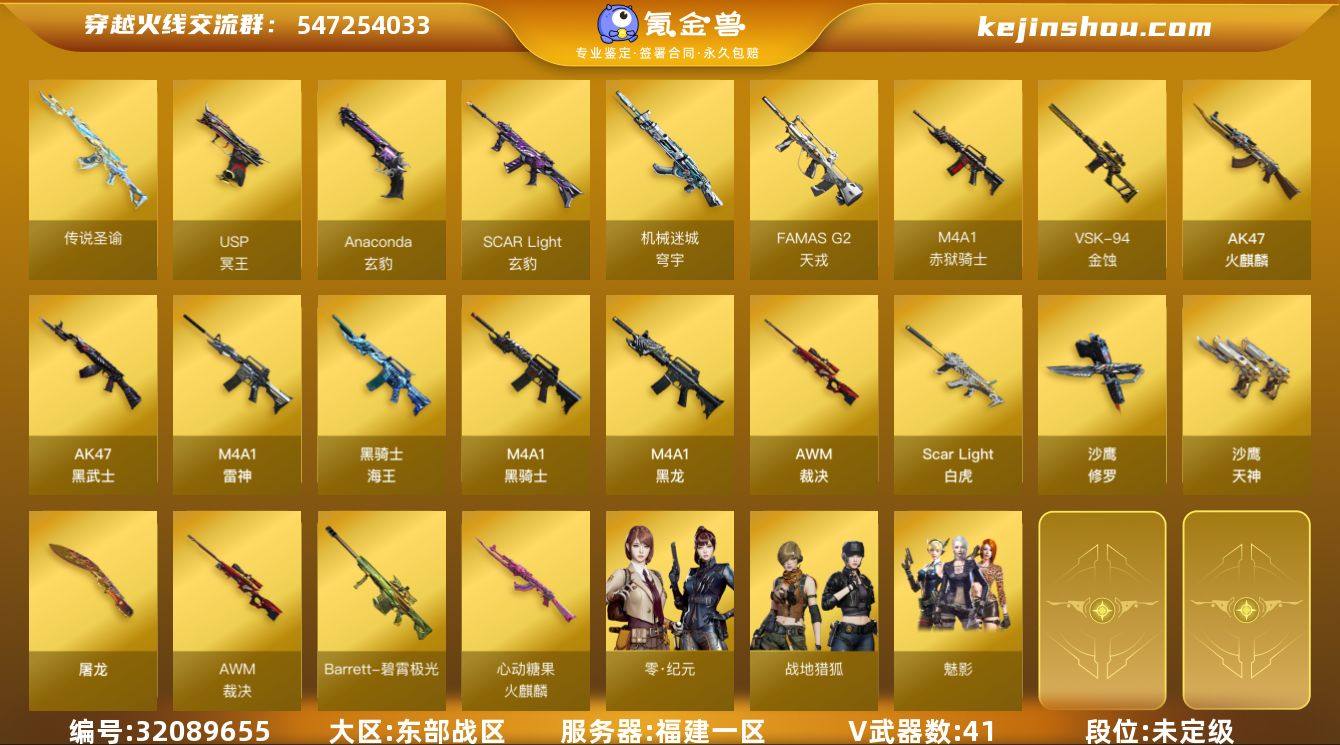 MCF850【41V 传说圣谕 传说星骇 白虎 2黑骑士 3音效卡 裁决 天罚 碧霄极光】【传说武器】:传说圣谕 【传说角色】:传说星骇 【热门武器】:传说圣谕,Scar Light-白虎,M4A1-黑骑士*2,加特林-炼狱,沙鹰-修罗*2 【音效卡】:AWM-裁决音效卡,QBZ03-天罚音效卡,Barrett-碧霄极光音效卡 【皮肤】:Scar Light-白虎-暗星,裁决-运输船 皮肤,火麒麟-心动糖果,屠龙-惊鸿 皮肤 【角色】:魅影,荆棘,战地猎狐,乔伊教练,修道士,初恋灵狐,嘉年华灵狐,娟娟,兰妹妹,零-水下丽影,灵狐者-X,龙儿-小淘气,麻雀,萌儿,蛇姬,斯沃特-X,蜀雪,铁骑荣耀,兔囡囡,雪莉杨,智影 【人偶武器】:异变清道夫-蛇影双骄,AWM-灵狐-15周年嘉年华,迷你超能女侍,迷你深渊冰龙*21,迷你裂空之翼,迷你波特博士*2,夺魂*4,迷你牛牛,迷你火种,生化手雷-机甲核心*2 【暴走生化】:超级对讲机 【挑战大师】:冰龙粉碎者-白马银枪,激光毁灭者III-白马银枪,机甲撕裂者III,试炼破坏者III,KAC-圣炎切割者III,神圣爆裂者-末日III,阐释者III 【英雄级武器】:AK47-火麒麟,M4A1-黑龙,M4A1-雷神*2,M4A1-黑骑士*2,AK47-黑武士,Scar Light-白虎,QBZ03-天罚*2,无影-神兵利器,FAMAS G2-天戎,SCAR Light-玄豹,黑骑士-海王*2,AWM-裁决,VSK-94-金蚀,加特林-炼狱,沙鹰-修罗*2,沙鹰-天神*4,USP-冥王*3,屠龙,丛林匕首-玄豹,高爆手雷-玄豹*2,闪光弹-玄豹*2,烟雾弹-玄豹*2,M4A1-赤狱骑士,Barrett-碧霄极光 【特殊枪械】:1白虎,2黑骑士,1炼狱