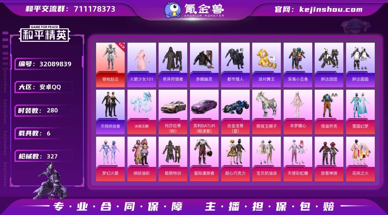 安卓【极品男神号/素材号/身法号 角色-银枪赵云(二级)/粉装-怪诞乔克/粉装-雪国幻梦/粉装-缤纷油彩/套装-赤蝎幽灵/套装-火箭少女101/套装-都市猎人/套装-派对舞王/套装-天网终结者/套装-金羽特工/套装-暗影哥特/甜心三姐妹/粉装-放客神游/角色-洛天依/SCAR-L-纯梦嫁纱(七级)/M416-五爪金龙(四级)/M416-超新星(六级)/玛莎拉蒂Ghibli(粉)/宾利BATUR(极速紫)】 手Q-1神装-27粉装-17特效枪-6载具-6粉色飞行器-124961热力值-23王牌印记-280套装-327枪皮 【红色神装等级】:角色-银枪赵云(二级) 【红色角色神装】:角色-银枪赵云 【热门品类】:粉装-怪诞乔克,粉装-雪国幻梦,粉装-梦幻火箭,粉装-缤纷油彩,套装-浪漫天命,套装-赤蝎幽灵,套装-火箭少女101,套装-都市猎人,套装-派对舞王,套装-深海小丑鱼,套装-小丑鱼,套装-奇异狩猎者,套装-胖达团团,套装-胖达圆圆,套装-天网终结者,套装-金羽特工,角色-忠猛周仓,角色-忠真马岱,套装-龟仙人,套装-暗影哥特,套装-软软马卡龙,大砍刀-青龙偃月刀,撬棍-龙胆亮银枪 【粉色套装】:粉装-极限特训,粉装-星际漫游者,粉装-怪诞乔克,粉装-甜心巧克力,粉装-宝贝奶油派,粉装-天使彩虹糖,粉装-雪国幻梦,粉装-梦幻火箭,粉装-缤纷油彩,粉装-放客神游,粉装-花间之火,粉装-冰霜白皇,粉装-炙焰红王,粉装-蜜桃特工,角色-洛天依,粉装-海渊国主,粉装-酣梦娃娃,粉装-甜梦小狐,粉装-暖熊萌萌,粉装-灵感创作师,女娲后裔-赵灵儿,粉装-冰川幽秘,粉装-启明星,粉装-天星战神,粉装-闲梦青缨,角色-羊梦糖心,角色-罪夜之冕 【粉色枪皮等级】:AKM-百合蜜语(五级),SCAR-L-纯梦嫁纱(七级),M416-五爪金龙(四级),M416-超新星(六级),AUG-罪夜之冕(五级),ACE32-萌骑漫游(一级),UMP45-相思残雪(七级),AKS-74U-森灵之息(五级),P90-魔童闹海 敖丙(三级)...