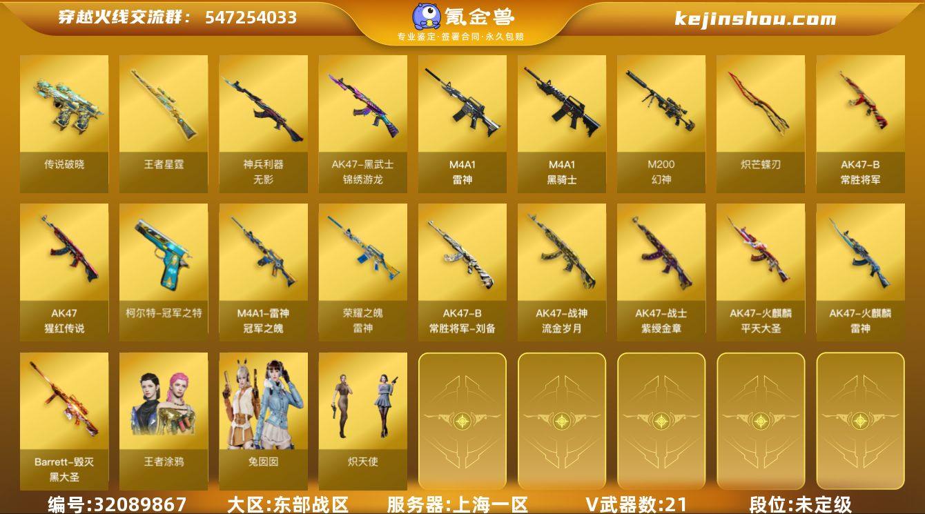 上海一区-23V-3王者-0炫金 【传说武器】:传说破晓 【热门武器】:传说破晓,M200-幻神,死亡之眼,柯尔特-冠军之特*3,M4A1-黑骑士,炽芒蝶刃 【王者炫金武器】:王者星霆 【皮肤】:幻神-宠儿-2021MVP,ScarLight-白虎-冠军之虎皮肤,雷神-荣耀之魄,雷神-冠军之魄,雷神-维纳斯皮肤,火麒麟-雷神,火麒麟-平天大圣,毁灭-黑大圣皮肤*2,战神-紫绶金章皮肤,战神-流金岁月皮肤,AK47-B-常胜将军-刘备,屠龙-春桃 皮肤 【角色】:战地猎狐,王者涂鸦,奇洋探员,乔伊教练,云海玲珑,炽天使,暗夜-X,初恋灵狐,芳心审判者,飞虎队-X,娟娟,兰-海滩派对,猎狐者-追月,0号玩家,零-水下丽影,灵狐者-X,灵狐者-七夕宝贝,曼陀罗-X,曼陀罗-礼服,萌儿,铁骑荣耀,兔囡囡,铁扇公主-暗灵,夜玫瑰-宠粉,樱-战斗天使,游珑儿 【人偶武器】:迷你深渊冰龙,夺魂,生化手雷-机甲核心,深渊终结者手雷*2,迷你艾比 【暴走生化】:死亡之眼,超级对讲机 【挑战大师】:冰龙粉碎者-白马银枪*2,激光毁灭者III-白马银枪,神圣爆裂者-末日III 【英雄级武器】:M4A1-雷神*2,M4A1-黑骑士,无影-神兵利器,黑武士-锦绣游龙,AK-47-猩红传说,AK47-B-常胜将军,M200-幻神,王者之怒-觉醒版,王者之决-觉醒版,柯尔特-冠军之特*3,炽芒蝶刃,高爆手雷-云龙,闪光弹-云龙 【道具】:XROCK炫彩背包,亚洲杯纪念炫彩背包,背包-洛丽塔,背包-葫芦兄弟,超级背包,黑桃战神背包,女皇终结者-魔龙之吻,救世主-黑桃战神,黄金生化钩,绿色巨人,灵魂忍者*2,变异宝贝,迷雾幽灵*2,夺命之镰,防化服*3,星辰流光-枪王排位,流光-再燃火线,枪王排位28赛季金色流光,枪王排位29赛季金色流光,零-水下丽影表情,EP战队名片,EP战队喷图,防弹头盔*4,防弹衣*4,C4工具钳*4,手雷包*4 【特殊枪械】:1黑骑士