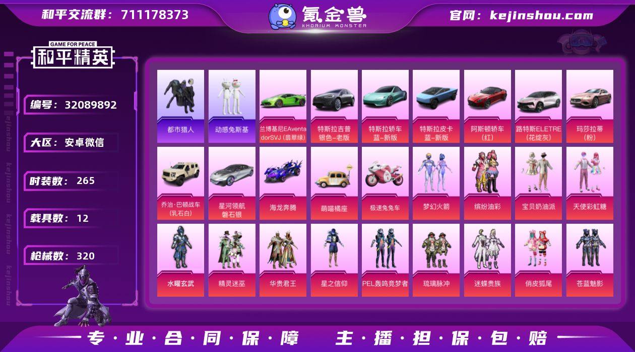 安卓 微信-26粉装-12特效枪-12载具-7粉色飞行器-131081热力值-7王牌印记-265套装-320枪皮 【热门品类】:粉装-梦幻火箭,粉装-缤纷油彩,套装-都市猎人,套装-金羽特工,套装-忍者信条,套装-动感兔斯基人偶服,套装-SS1特训,套装-龟仙人,套装-潮萌小黄鸭,套装-浪漫波比,套装-粉红小猪,M416-星际漫游,熔岩游骑兵连帽夹克 【粉色套装】:粉装-宝贝奶油派,粉装-天使彩虹糖,粉装-水曜玄武,粉装-精灵迷巫,粉装-梦幻火箭,粉装-华贵君王,粉装-星之信仰,粉装-缤纷油彩,粉装-PEL轰鸣竞梦者,粉装-琉璃脉冲,粉装-迷蝶贵族,粉装-俏皮狐尾,粉装-苍蓝魅影,粉装-翡翠骑士,粉装-绚金战神,粉装-银刃赛罗,粉装-银龙傲海,粉装-骨龙祭渊,粉装-齐天大圣,角色-洛天依,粉装-甜心娃娃,粉装-精灵娃娃,粉装-霞光圣骑,粉装-寒光使者,角色-白勺歌姬,角色-呆萌星弥 【粉色枪皮等级】:AKM-甜心宝贝(五级),SCAR-L-梦幻火箭(五级),M416-五爪金龙(四级),M416-心之恋语(七级),M762-甜蜜誓约(五级),M762-激战未来(四级),Kar98K-伏魔团(四级),M24-星之信仰(四级),AWM-焰龙焚天(四级),Mini14-龙虾霸霸(四级),SLR-暗夜玫瑰(四级),MG3-炙焰牛王(五级) 【粉色载具】:特斯拉Model X(冷光银),特斯拉Roadster(水滴蓝),特斯拉Cybertruck(荒芜蓝),兰博基尼Aventador SVJ(翡翠绿),阿斯顿马丁DBS(红),路特斯ELETRE(花绽灰),玛莎拉蒂Ghibli(粉),乔治巴顿战车(乳石白),星河领航(磐石银),海龙奔腾,萌喵橘座,极速兔兔车 【粉色枪皮】:AKM-甜心宝贝,SCAR-L-梦幻火箭,M416-五爪金龙,M416-心之恋语,M762-甜蜜誓约,M762-激战未来,Kar98K-伏魔团,M24-星之信仰,AWM-焰龙焚天,Mini14-龙虾霸霸,SLR-暗夜玫瑰,MG3-炙焰牛王 【粉色飞行器】:梦幻火箭飞行器,神秘黑猫飞行器,终极赛罗飞...