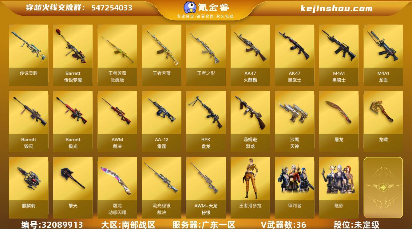 广东一区-39V-5王者-0炫金 【传说武器】:传说梦魇,传说灵眸 【热门武器】:传说梦魇,传说灵眸,M14EBR-玄武,死亡之眼,M4A1-黑骑士,汤姆逊-烈龙*5,RPK-盘龙*5,加特林-炼狱*2 【王者炫金武器】:王者之影,王者芳薇 【音效卡】:Barrett-毁灭音效卡,Barrett-极光音效卡 【皮肤】:裁决-流光秘银,毁灭-英雄计划 皮肤,天龙-秘银 【角色】:魅影,审判者,王者潘多拉,暗夜-X,风暴女,嘉年华灵狐,灵狐者-X,灵狐者-黄金海岸,麻雀,潘多拉-甜心教官,斯沃特-X,铁骑荣耀 【人偶武器】:斯泰尔-枪娘暗刃,AWM-灵狐-15周年嘉年华,COP-旗袍,迷你生化手雷*3 【暴走生化】:死亡之眼,超级对讲机 【挑战大师】:激光毁灭者III 【英雄级武器】:AK47-火麒麟,M4A1-黑骑士,AK47-黑武士,M4A1-龙血,M14EBR-玄武,Barrett-毁灭,Barrett-极光,AWM-裁决,王者之光-觉醒版,RPK-盘龙*5,加特林-炼狱*2,悦蓝-惊涛骇浪-觉醒版,汤姆逊-烈龙*5,烈龙-悦心-觉醒版,AA-12-雷霆*2,沙鹰-天神,屠龙*2,龙啸,擎天,麒麟刺*4 【道具】:战舰背包,超级背包,救世主-黑桃战神,绿色巨人,灵魂忍者,变异宝贝,迷雾幽灵,夺命之镰,防化服*2,金色流光-枪王排位,星辰流光-枪王排位,枪王排位28赛季金色流光,枪王排位29赛季金色流光,防弹头盔*6,防弹衣*6,C4工具钳*6,手雷包*6 【特殊枪械】:1黑骑士,5烈龙,5盘龙,2炼狱