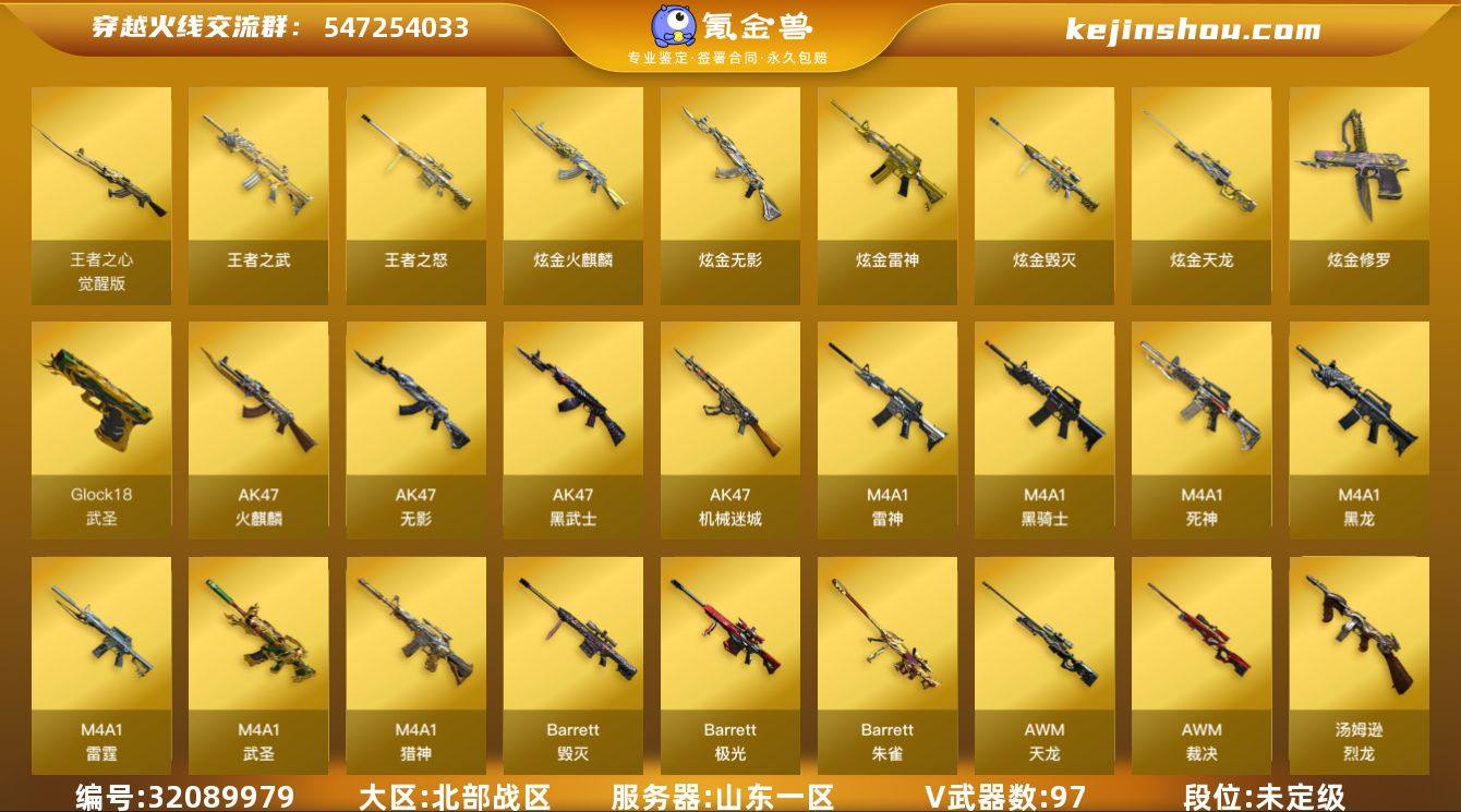 山东一区-111V-10王者武器数-7炫金武器数 【热门武器】:M200-竞技荣光,死亡之眼*5,M4A1-黑骑士,汤姆逊-烈龙*6,加特林-炼狱,USP-雷暴,沙鹰-修罗*6 【王者炫金武器】:王者之武,王者之怒,炫金火麒麟,炫金无影,炫金雷神,炫金武士,炫金毁灭,炫金天龙,炫金修罗 【音效卡】:AK47-火麒麟音效卡,M4A1-雷神音效卡,M4A1-黑骑士音效卡,Barrett-毁灭音效卡 【皮肤】:烈龙-星空,雷神-能量核心,雷神-荣耀之魄,雷神-星空*2,雷神-耀金皮肤,雷神-冠军之魄,火麒麟-雷神,火麒麟-冠军之心,毁灭-荣耀之怒,毁灭耀金皮肤,毁灭-星空*2,黑龙-能量核心,黑骑士-暗月,AK47-黑武士-361,AWM-天龙-传奇白鲨,修罗-能量核心*2,擎天-秘银*3 【角色】:葵,樱,瞳,魅影,炫,电竞教官-云悠悠,王者春,灵狐者-黄金海岸,潘多拉-X,蜀雪,影武者-X 【人偶武器】:火麒麟-灵狐,COP-旗袍 【暴走生化】:死亡之眼*5 【挑战大师】:激光毁灭者III 【英雄级武器】:AK47-火麒麟*2,M4A1-黑龙*3,M4A1-雷神*2,M4A1-黑骑士,AK47-无影*2,M4A1-死神*3,AK47-黑武士*5,M4A1-武圣,AK47-机械迷城*3,M4A1-雷霆,M4A1-猎神,王者之心-觉醒版,王者之影-觉醒版,王者之武-觉醒版,王者之魄-觉醒版,王者之势-觉醒版,AK-47-猩红传说,AWM-天龙*3,Barrett-毁灭*3,Barrett-极光,AWM-裁决*2,Barrett-朱雀,M200-竞技荣光,王者之怒-觉醒版,王者之光-觉醒版,王者之决-觉醒版,加特林-炼狱,汤姆逊-烈龙*6,沙鹰-修罗*6,沙鹰-天神,USP-雷暴,COP-雷霆,柯尔特-竞技荣光,Glock18-武圣,屠龙*7,擎天,擎天-竞技荣光,高爆手雷-雷霆*7,高爆手雷-竞技荣光*4,闪光弹-雷霆*7,闪光弹-竞技荣光*3,烟雾弹-雷霆*7,烟雾弹-竞技荣光*3 【道具】:炫彩背包,超级背包,变异宝贝,生化弹匣,夺命之镰,防化服,云海游龙表情,...