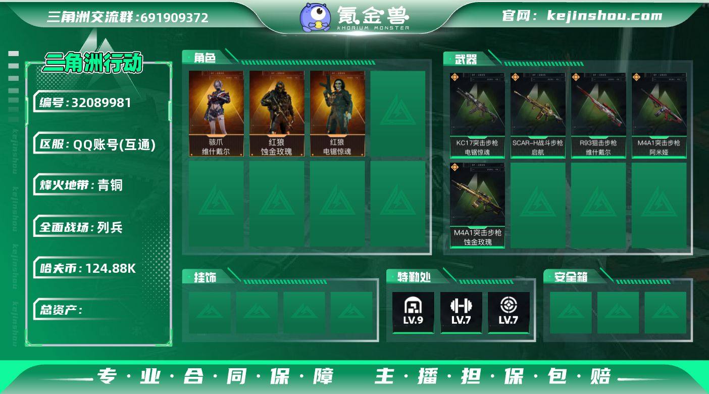 【特价出售】" 总资产311.78M,哈夫币 124885.26K,战场等级:22 上等兵,行动等级:60 白银,角色皮肤3,枪皮数量30【特战干员外观】红狼-蚀金玫瑰,骇爪-维什戴尔,红狼-电锯惊魂,【近战】近战-黑鹰,【典藏外观】K416突击步枪-潜袭者,【步枪】腾龙突击步枪-马年祥瑞,腾龙突击步枪-万金泪冠,M4A1突击步枪-阿米娅,M4A1突击步枪-蚀金玫瑰,SCAR-H战斗步枪-启航,KC17突击步枪-电锯惊魂,SCAR-H战斗步枪-荣耀列队,K416突击步枪-碳纤维,AK-12突击步枪-零点,M4A1突击步枪-零点,M4A1突击步枪-海色,QBZ95-1突击步枪-海色,PTR-32突击步枪-黄蜂,腾龙突击步枪-三角洲力量,SCAR-H战斗步枪-数码迷彩,M7战斗步枪-红色涂装,AUG突击步枪-浅蓝涂装,SG552突击步枪-浅蓝涂装,K416突击步枪-高雅黑,【狙击步枪/射手步枪】AWM狙击步枪-万金泪冠,R93狙击步枪-维什戴尔,SVD狙击步枪-战术行动,【冲锋枪】MP7冲锋枪-六套之力,勇士冲锋枪-万金泪冠,SMG-45冲锋枪-前沿科技,SMG-45冲锋枪-行动开启,【轻机枪/霰弹枪】M1014霰弹枪-幻影结构,M249轻机枪-黄蜂,M1014霰弹枪-高雅黑,【手枪】G18-马年祥瑞,【载具外观】轮式突击炮-荣耀,轮式突击炮-巅峰竞赛,M1A4坦克-巅峰竞赛,突击直升机-原始伪装,M1A4坦克-护林人,M1A4坦克-烟火2026,GTQ35坦克-烟火2026,突击车-寒梅,轮式突击炮-烟火2026,F-45A战斗机-夜间迷彩,侦察直升机-烟火2026,F-45A战斗机-建造,"