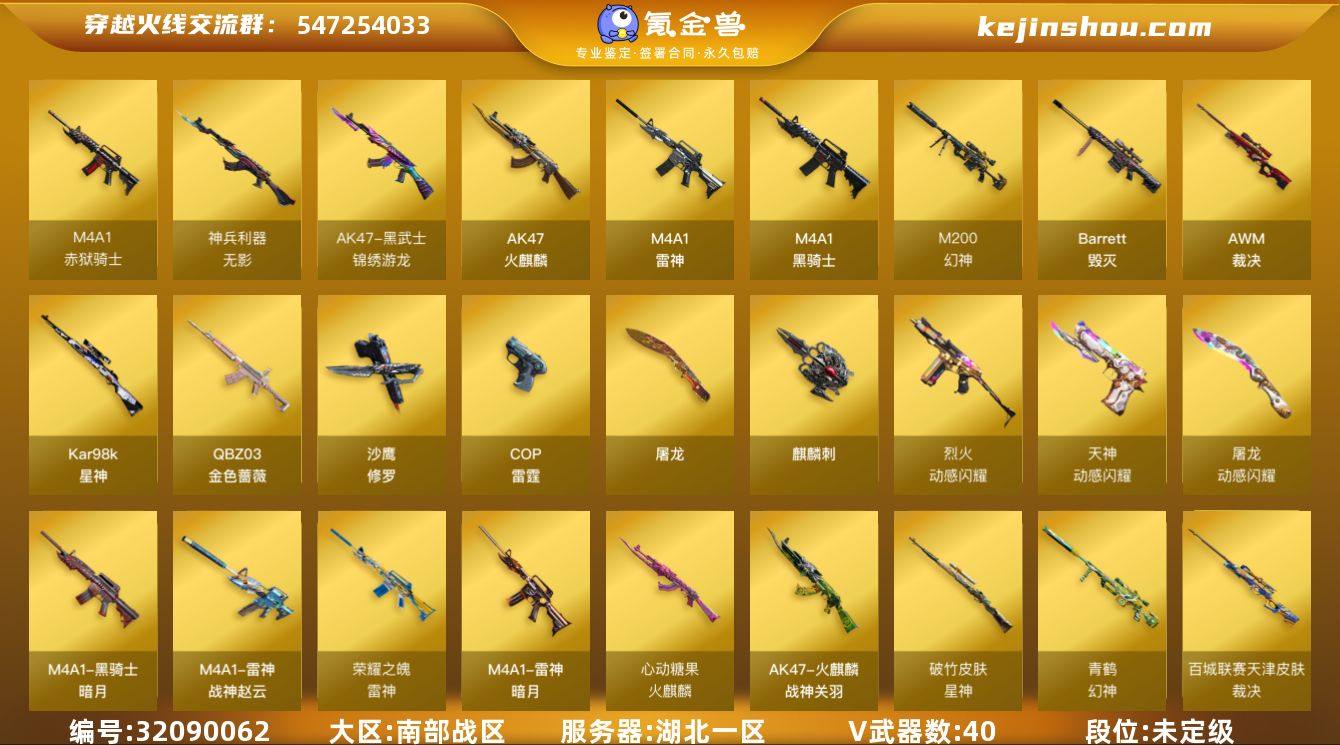 湖北一区-43V-1王者武器数-0炫金武器数 【热门武器】:QBZ03-金色蔷薇,M200-幻神,Kar98K-星神,M4A1-黑骑士,沙鹰-修罗*2 【王者炫金武器】:王者之魄闪光弹 【音效卡】:枪娘语音包-阿敏 【皮肤】:幻神-青鹤,幻神-宠儿-2021MVP,幻神-KZ-CFPLS25冠军 皮肤,QBZ03-AG-CFPLS19冠军,AWM-裁决-百城联赛天津皮肤,裁决-羽掣 皮肤,星神-破竹皮肤,星神-巅峰荣耀 皮肤,雷神-暗月,雷神-荣耀之魄,M4A1-战神赵云,火麒麟-战神关羽,火麒麟-心动糖果,毁灭耀金皮肤*2,黑骑士-暗月,极光-能量核心 【角色】:枪娘樱,乔伊教练,云海玲珑,暗夜-X,飞虎队-X,风暴女,嘉年华灵狐,灵狐-花神,麻雀,潘多拉-X,潘多拉-甜心教官,斯沃特-X,铁骑荣耀,游珑儿 【人偶武器】:生化手雷-机甲核心 【挑战大师】:冰龙粉碎者-白马银枪 【英雄级武器】:AK47-火麒麟*2,M4A1-雷神,M4A1-黑骑士,QBZ03-天罚,无影-神兵利器,黑武士-锦绣游龙,QBZ03-金色蔷薇,烈火-动感闪耀,Barrett-毁灭,AWM-裁决,M200-幻神,Kar98K-星神,沙鹰-修罗*2,COP-雷霆,天神-动感闪耀,屠龙,麒麟刺*2,屠龙-动感闪耀,高爆手雷-雷霆*5,手雷-动感闪耀,闪光弹-雷霆*6,烟雾弹-雷霆*5,M4A1-赤狱骑士 【道具】:EP战队炫彩背包,亚洲杯纪念炫彩背包,全能枪王背包,炫彩背包,救世主-黑桃战神,绿色巨人,灵魂忍者,迷雾幽灵,夺命之镰,防化服*2,金色流光-枪王排位*2,星辰流光-枪王排位,枪王排位28赛季金色流光,动感闪耀表情,防弹头盔*3,防弹衣*3,C4工具钳*3,手雷包*3 【特殊枪械】:1黑骑士