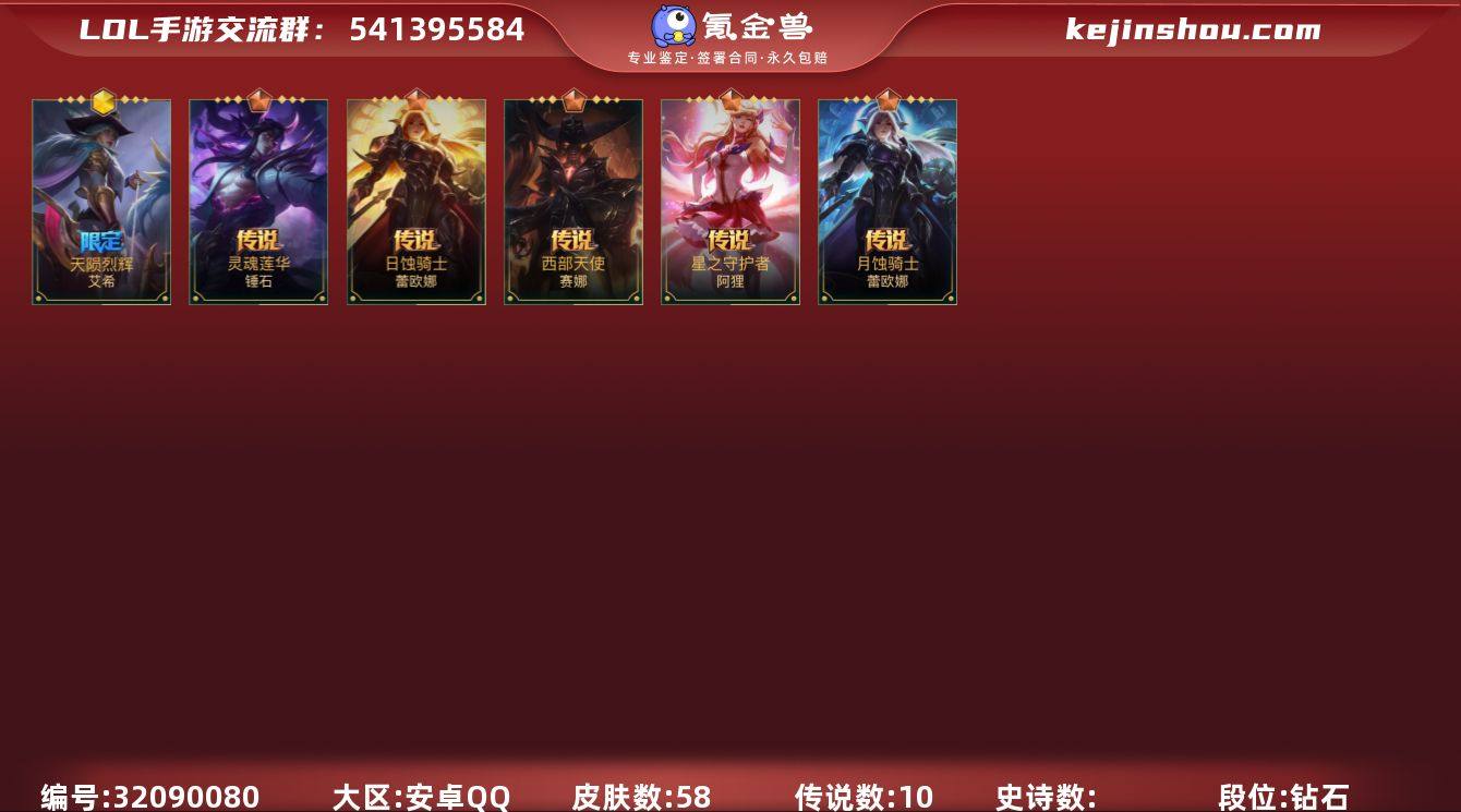 DSL513安卓Q-2神话-10传说-13史诗-57英雄-58皮肤 段位:钻石 【神话】 天陨烈辉艾希 至臻 星域秘刃泰隆 【传说】 星域游侠崔斯特 日蚀骑士蕾欧娜 灵魂莲华锤石 神龙尊者 驭风啸龙 神王德莱厄斯 西部天使赛娜 星之守护者阿狸 炼狱魔犬内瑟斯 月蚀骑士蕾欧娜 灌篮高手德莱厄斯