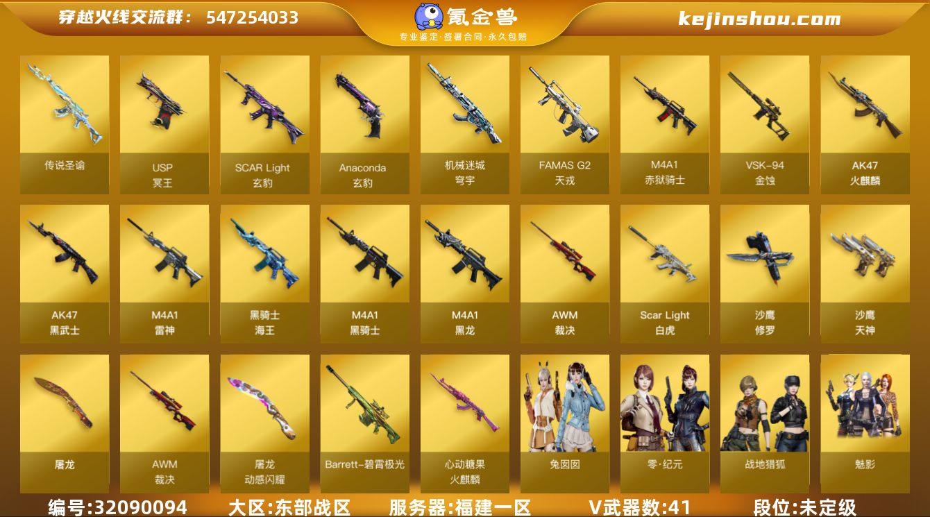 MCF850【41V 传说圣谕 传说星骇 白虎 2黑骑士 3音效卡 裁决 天罚 碧霄极光】【传说武器】:传说圣谕 【传说角色】:传说星骇 【热门武器】:传说圣谕,Scar Light-白虎,M4A1-黑骑士*2,加特林-炼狱,沙鹰-修罗*2 【音效卡】:AWM-裁决音效卡,QBZ03-天罚音效卡,Barrett-碧霄极光音效卡 【皮肤】:Scar Light-白虎-暗星,裁决-运输船 皮肤,火麒麟-心动糖果,屠龙-惊鸿 皮肤 【角色】:魅影,荆棘,战地猎狐,乔伊教练,修道士,初恋灵狐,嘉年华灵狐,娟娟,兰妹妹,零-水下丽影,灵狐者-X,龙儿-小淘气,麻雀,萌儿,蛇姬,斯沃特-X,蜀雪,铁骑荣耀,兔囡囡,雪莉杨,智影 【人偶武器】:异变清道夫-蛇影双骄,AWM-灵狐-15周年嘉年华,迷你超能女侍,迷你深渊冰龙*21,迷你裂空之翼,迷你波特博士*2,夺魂*4,迷你牛牛,迷你火种,生化手雷-机甲核心*2 【暴走生化】:超级对讲机 【挑战大师】:冰龙粉碎者-白马银枪,激光毁灭者III-白马银枪,机甲撕裂者III,试炼破坏者III,KAC-圣炎切割者III,神圣爆裂者-末日III,阐释者III 【英雄级武器】:AK47-火麒麟,M4A1-黑龙,M4A1-雷神*2,M4A1-黑骑士*2,AK47-黑武士,Scar Light-白虎,QBZ03-天罚*2,无影-神兵利器,FAMAS G2-天戎,SCAR Light-玄豹,黑骑士-海王*2,AWM-裁决,VSK-94-金蚀,加特林-炼狱,沙鹰-修罗*2,沙鹰-天神*4,USP-冥王*3,屠龙,丛林匕首-玄豹,高爆手雷-玄豹*2,闪光弹-玄豹*2,烟雾弹-玄豹*2,M4A1-赤狱骑士,Barrett-碧霄极光 【特殊枪械】:1白虎,2黑骑士,1炼狱