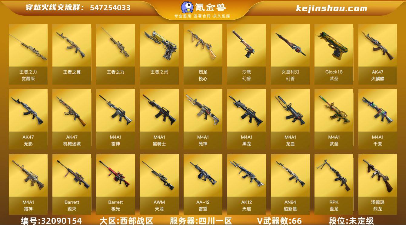 四川一区-68V-5王者-0炫金 【热门武器】:死亡之眼,M4A1-黑骑士*2,汤姆逊-烈龙*6,RPK-盘龙*6,加特林-炼狱*3,沙鹰-修罗*2,金刚伞,高爆手雷-幻兽 【王者炫金武器】:王者之翼,王者之力,烈龙-悦心,王者之灵 【皮肤】:雷神-星空,火麒麟-平天大圣,毁灭-星空*2,M4A1-千变-孔明皮肤,黑龙-能量核心,修罗-能量核心*2 【角色】:葵,樱,王者之瞳,狐影,暗夜-X,北极狐-X,娟娟,灵狐者-X,灵狐者-黄金海岸,龙儿,龙儿-小淘气,麻雀,潘多拉-X,蜀雪,铁骑荣耀 【人偶武器】:迷你深渊冰龙,迷你裂空之翼,夺魂,生化手雷-机甲核心*2 【暴走生化】:死亡之眼,超级对讲机 【挑战大师】:AK47-冰龙粉碎者,激光毁灭者III,神圣爆裂者-末日III 【英雄级武器】:M4A1-千变,AK47-火麒麟,M4A1-黑龙*3,M4A1-雷神*5,M4A1-黑骑士*2,AK47-无影,M4A1-死神,AK12-天启,AN94-超新星*4,M4A1-武圣,AK47-机械迷城,M4A1-龙血,M4A1-猎神,AWM-天龙,Barrett-毁灭*3,Barrett-极光,RPK-盘龙*6,加特林-炼狱*3,炼狱-悦蓝-觉醒版,汤姆逊-烈龙*6,AA-12-雷霆,沙鹰-修罗*2,沙鹰-天神*3,沙鹰-幻兽,Glock18-武圣,屠龙*2,龙啸,擎天,麒麟刺*2,女皇利刃-幻兽,高爆手雷-雷霆,高爆手雷-幻兽,闪光弹-雷霆,闪光弹-幻兽,烟雾弹-雷霆,烟雾弹-幻兽 【道具】:战舰背包,炫彩背包,老虎背包,背包-洛丽塔,超级背包,绿色巨人,灵魂忍者*2,变异宝贝,妖姬,迷雾幽灵,生化弹匣,夺命之镰,防化服*2,防弹头盔*5,防弹衣*7,C4工具钳*4,手雷包*6 【特殊枪械】:2黑骑士,6烈龙,6盘龙,3炼狱