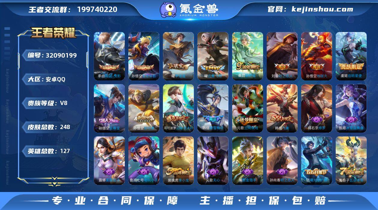 V8 2典藏 6传说 248皮肤 127英雄 【2水晶】李白-鸣剑·曳影,孙悟空-全息碎影【6传说】刘备-时之恋人,孙悟空-地狱火,曜-李逍遥,虞姬-启明星使,曜-云鹰飞将,桑启-鸣野蒿【62史诗】元歌-无心,鬼谷子-五谷丰年,赵云-未来纪元,钟无艳-超时空战士,澜-赏金猎手,安琪拉-心灵骇客,白起-星夜王子,百里守约-特工魅影,百里玄策-原初追逐者,百里玄策-热力回旋,曹操-幽灵船长,蔡文姬-繁星吟游,嫦娥-拒霜思,妲己-女仆咖啡,妲己-魅力维加斯,狄仁杰-魔术师,狄仁杰-鹰眼统帅,貂蝉-圣诞恋歌,伽罗-箭羽风息,公孙离-无限星赏官,宫本武藏-鬼剑武藏,韩信-飞衡,韩信-傲雪梅枪,花木兰-水晶猎龙者,橘右京-修罗,铠-曙光守护者,兰陵王-暗隐猎兽者,李白-千年之狐,廉颇-地狱岩魂,刘禅-天才门将,露娜-紫霞仙子,鲁班七号-电玩小子,吕布-圣诞狂欢,墨子-金属风暴,上官婉儿-梁祝,裴擒虎-李小龙,孙策-猫狗日记,孙尚香-水果甜心,孙尚香-蔷薇恋人,孙尚香-时之恋人,孙悟空-至尊宝,孙悟空-孙行者,王昭君-偶像歌手,西施-诗语江南,夏侯惇-乘风破浪,小乔-缤纷独角兽,雅典娜-冰冠公主,雅典娜-黎明之约,亚瑟-心灵战警,杨玉环-遇见飞天,嬴政-摇滚巨星,嬴政-暗夜贵公子,嬴政-优雅恋人,元歌-云间偶戏,赵云-皇家上将,甄姬-冰雪圆舞曲,诸葛亮-黄金分割率,庄周-高山流水,梦奇-顽趣,刘禅-电玩·爆裂旋风,马可波罗-山海·玄木吟,蒙恬-荣光圣徽
