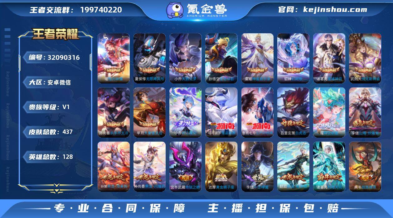 安卓WX-V0-荣耀黄金III段位-128英雄-437皮肤-10典藏皮肤-1典藏英雄-1无双-2珍品传说-38传说-147史诗 【英雄全皮】:廉颇全皮,刘邦全皮,李信全皮,猪八戒全皮 【荣耀典藏】:武则天英雄,孙悟空全息碎影,武则天倪克斯神谕,夏侯惇无限飓风号,小乔天鹅之梦,孙尚香杀手不太冷,芈月大秦宣太后,诸葛亮星域神启,貂蝉幻阙歌,虞姬神鉴启示录,瑶拾光映像 【无双皮肤】:小乔时之魔女 【珍品传说】:马可波罗怪盗基德,鲁班七号江户川柯南 【传说皮肤】:王昭君映山客,桑启鸣野蒿,典韦战鼓燎原,孙尚香乘龙问璇玑,孙策乘龙淬吴钩,赵云乘龙铭钟鼎,艾琳觅芳踪,亚瑟追逃游戏,安琪拉追逃游戏,干将莫邪画中仙,李信山海炽霜斩,孙策末日机甲,瑶时之祈愿,鲁班七号寅虎瑞焰,孙尚香异界灵契,赵云淬星耀世,王昭君乞巧织情,周瑜音你心动,小乔音你心动,李元芳飞鸢探春,诸葛亮时雨天司,铠绛天战甲,虞姬启明星使,孙悟空零号赤焰,曜云鹰飞将,李信一念神魔,刘备时之恋人,貂蝉猫影幻舞,干将莫邪久胜战神,虞姬云霓雀翎,达摩黄金狮子座,百里玄策白虎志,后羿黄金射手座,诸葛亮武陵仙君,宫本武藏地狱之眼,孙悟空地狱火,武则天海洋之心,狄仁杰超时空战士 【限定皮肤】:蒙犽顽岩魄,蔡文姬夏日便利店,大乔绒语心约,虞姬夏日便利店,姜子牙天穹之誓,杨戬破阵退雄兵,狄仁杰阴阳师,小乔纯白花嫁,廉颇寅虎御盾,赵云皇家上将,赵云龙胆,赵云百木心枪,墨子神迹守卫,妲己热情桑巴,嬴政优雅恋人,孙尚香异界灵契,鲁班七号狮舞东方,鲁班七号乒乒小将,鲁班七号寅虎瑞焰,庄周云端筑梦师,庄周高山流水,高渐离死亡摇滚,阿轲迷踪丽影,钟无艳超时空战士,孙膑天狼运算者,扁鹊奇幻香踪,白起夜都怪侠,芈月白晶晶,芈月幻夜卜梦,吕布御风骁将,周瑜真爱至上,周瑜赤莲之焰,元歌云间偶戏,元歌...