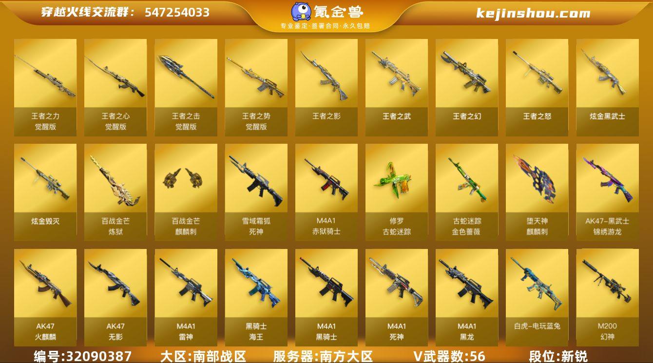 南方大区-60V-8王者武器数-2炫金武器数 【热门武器】:M14EBR-玄武,M200-幻神,金色蔷薇-古蛇迷踪,修罗-古蛇迷踪,死亡之眼,白虎-电玩蓝兔,Kar98K-星神,Cat-刀锋,M4A1-黑骑士,汤姆逊-烈龙*6,加特林-炼狱,沙鹰-修罗*4 【王者炫金武器】:王者之幻,王者之武,王者之影,王者之怒,炫金武士,炫金毁灭 【音效卡】:AK47-火麒麟音效卡,M4A1-雷神音效卡,Barrett-毁灭音效卡,白虎-盛典舞曲音效卡,炼狱-百战金芒-庆典舞曲音效卡,死神-雪域霜狐-怀旧音效卡,柯尔特-百战金芒-庆典舞曲音效卡 【皮肤】:白虎-百战金芒 皮肤,裁决-羽掣 皮肤,雷神-暗月*2,雷神-星空,雷神-源计划2.0专属 皮肤,雷神-化蛇 皮肤,M4A1-再燃火线,火麒麟-AG战队皮肤,火麒麟-百城,毁灭耀金皮肤,毁灭-星空,毁灭-神秘黑洞皮肤,黑龙-能量核心,黑骑士耀金皮肤,无影-能量核心,修罗-能量核心,轻型军用手斧-再燃火线 【角色】:零,战地猎狐,雪域霜狐,蛇隐宗,空,暗夜-X,初恋灵狐,电竞少女,芳心审判者,飞虎队-X,猎狐者-追月,0号玩家,零-水下丽影,灵狐者-黄金海岸,灵狐者-七夕宝贝,龙儿,龙儿-小淘气,麻雀,萌儿,娜塔莉娅,潘多拉-甜心教官,蛇姬,斯沃特-X,蜀雪,兔囡囡,新娜塔莎,雪莉杨-摸金校尉 【人偶武器】:M4A1-雷神-精英刀锋,COP-旗袍,Cat-刀锋,夺魂,生化手雷-机甲核心*2 【暴走生化】:死亡之眼 【挑战大师】:激光毁灭者III-白马银枪 【英雄级武器】:AK47-火麒麟,M4A1-黑龙,M4A1-雷神*2,M4A1-黑骑士,AK47-无影,M4A1-死神,AK12-天启,M14EBR-玄武,黑武士-锦绣游龙,金色蔷薇-古蛇迷踪,死神-雪域霜狐,王者之心-觉醒版,王者之势-觉醒版,黑骑士-海王,白虎-电玩蓝兔,Barrett-毁灭*2,Barrett-极光,AWM-裁决,M200-幻神,Barrett-朱雀,Kar98K-星神,王者之力-觉醒版,加特林-炼狱,...