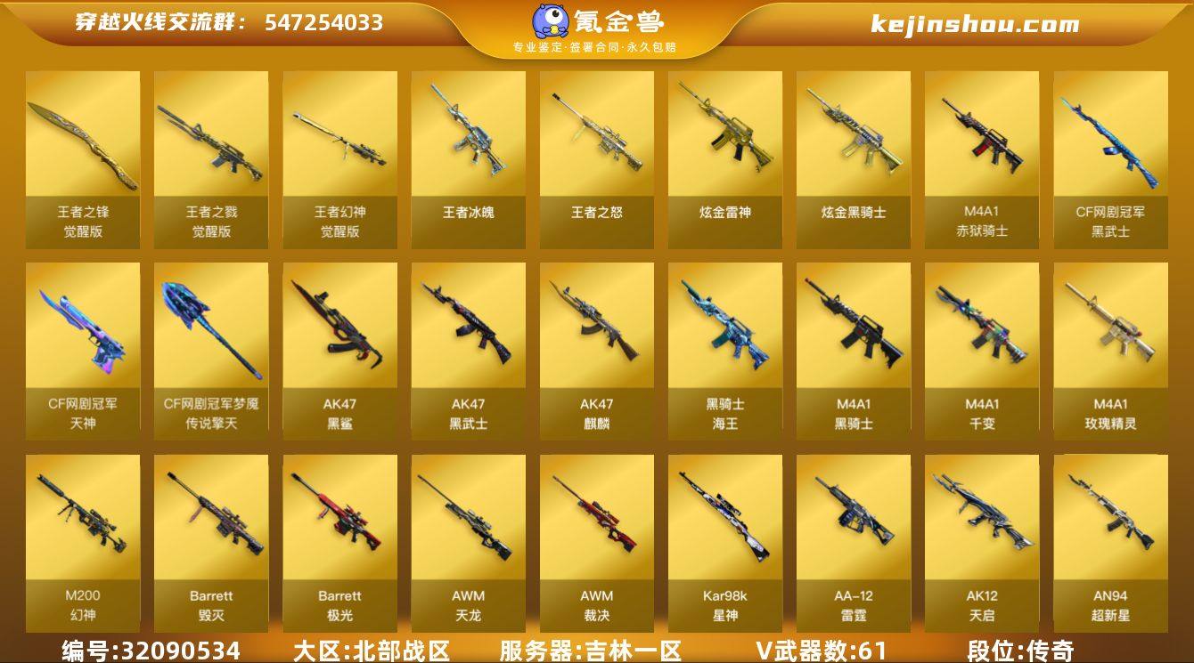 吉林一区-72V-7王者武器数-2炫金武器数 【热门武器】:QBZ03-金色蔷薇*2,M200-幻神,死亡之眼,Kar98K-星神,M4A1-黑骑士,汤姆逊-烈龙*6,RPK-盘龙*2,加特林-炼狱,沙鹰-修罗*2 【王者炫金武器】:王者冰魄,王者之怒,炫金骑士,炫金雷神 【音效卡】:Barrett-毁灭音效卡 【皮肤】:幻神-荣耀世冠EP 皮肤,裁决-胜者为王 皮肤,雷神-能量核心,火麒麟-平天大圣*2,毁灭耀金皮肤,毁灭-星空,毁灭-英雄计划 皮肤,黑龙-暗月,黑骑士-暗月,无影耀金皮肤,战神-紫绶金章皮肤 【角色】:葵,炫,迷迭香,战地猎狐,奇洋探员,乔伊教练,云海玲珑,炽天使,初恋灵狐,芳心审判者,风暴女*2,虎妞,0号玩家,灵狐者-X,灵狐者-七夕宝贝,麻雀,曼陀罗-X,潘多拉-甜心教官,青霞仙子,铁骑荣耀,兔囡囡,雪莉杨,智影 【人偶武器】:天龙-曼陀罗,火麒麟-灵狐*3,生化手雷-机甲核心,迷你超能女侍 【暴走生化】:死亡之眼 【英雄级武器】:M4A1-千变,AK47-麒麟,M4A1-黑骑士,AK47-黑武士,AK12-天启,AN94-超新星,AK47-黑鲨,M4A1-玫瑰精灵,QBZ03-金色蔷薇*2,王者之戮-觉醒版,黑骑士-海王*3,黑武士-CF网剧冠军,AWM-天龙,Barrett-毁灭*2,Barrett-极光,AWM-裁决,M200-幻神,Kar98K-星神,Barrett-金色蔷薇,王者幻神-觉醒版,RPK-盘龙*2,加特林-炼狱,汤姆逊-烈龙*6,AA-12-雷霆*5,沙鹰-修罗*2,沙鹰-天神*2,柯尔特-荣耀世冠EP,天神-CF网剧冠军,屠龙*2,龙啸*4,擎天*3,麒麟刺*2,擎天-CF网剧冠军,王者之锋-觉醒版,闪光弹-堕天神,M4A1-赤狱骑士 【道具】:XROCK炫彩背包,炫彩背包,超级背包,女皇终结者-魔龙之吻,救世主-黑桃战神,黄金生化钩,绿色巨人,灵魂忍者,迷雾幽灵,夺命之镰,防化服*2,枪王排位29赛季金色流光,斯沃特表情,EP战队击杀图标,C4-再燃火线,防弹头盔*3,防弹衣*3,C...