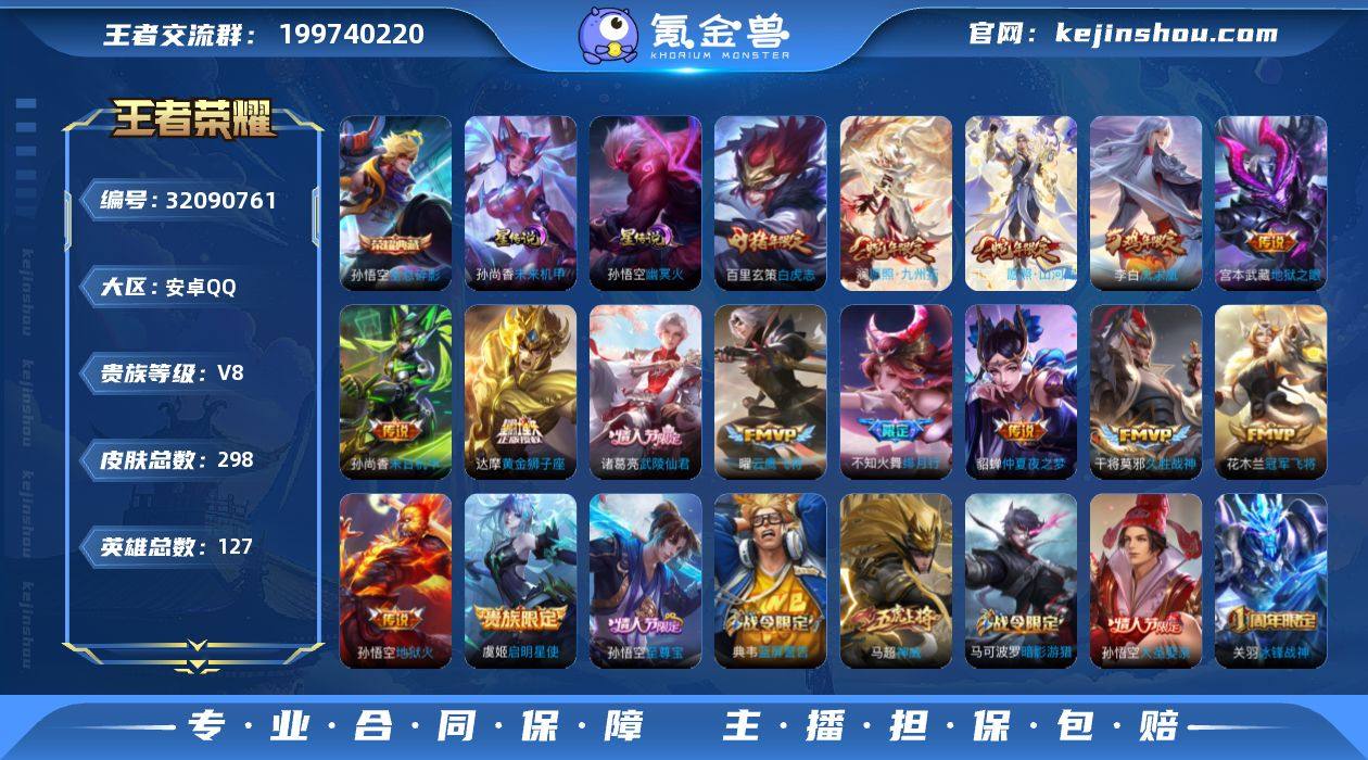 V8 1典藏 15传说 2星元 298皮肤 127英雄 【1水晶】孙悟空-全息碎影【15传说】不知火舞-绯月行,百里玄策-白虎志,达摩-黄金狮子座,貂蝉-仲夏夜之梦,干将莫邪-久胜战神,宫本武藏-地狱之眼,花木兰-冠军飞将,李白-凤求凰,孙尚香-末日机甲,孙悟空-地狱火,虞姬-启明星使,诸葛亮-武陵仙君,曜-云鹰飞将,司空震-愿照·山河定,澜-愿照·九州拓【2星元】孙尚香-未来机甲,孙悟空-幽冥火【63史诗】元歌-无心,赵云-未来纪元,阿轲-节奏热浪,阿轲-迷踪丽影,白起-星夜王子,百里守约-特工魅影,百里玄策-原初追逐者,曹操-幽灵船长,曹操-天狼征服者,蔡文姬-繁星吟游,嫦娥-拒霜思,妲己-魅力维加斯,大乔-猫狗日记,狄仁杰-魔术师,狄仁杰-鹰眼统帅,典韦-蓝屏警告,貂蝉-圣诞恋歌,宫本武藏-鬼剑武藏,关羽-冰锋战神,韩信-白龙吟,韩信-逐梦之影,花木兰-水晶猎龙者,橘右京-修罗,铠-曙光守护者,兰陵王-暗隐猎兽者,兰陵王-驯魔猎人,李白-千年之狐,李元芳-逐浪之夏,李元芳-银河之约,刘邦-德古拉伯爵,刘禅-绅士熊喵,露娜-紫霞仙子,鲁班七号-电玩小子,鲁班七号-狮舞东方,吕布-圣诞狂欢,吕布-末日机甲,马超-神威,马可波罗-暗影游猎,蒙犽-狂想玩偶喵,墨子-金属风暴,上官婉儿-梁祝,裴擒虎-李小龙,司马懿-暗渊魔法,孙尚香-水果甜心,孙悟空-大圣娶亲,孙悟空-至尊宝,王昭君-凤凰于飞,王昭君-偶像歌手,夏侯惇-乘风破浪,雅典娜-冰冠公主,雅典娜-黎明之约,亚瑟-心灵战警,杨玉环-遇见飞天,嬴政-摇滚巨星,嬴政-白昼王子,云中君-纤云弄巧,赵云-皇家上将,甄姬-冰雪圆舞曲,庄周-云端筑梦师,刘禅-电玩·爆裂旋风,蒙犽-百解令,蒙恬-荣光圣徽,弈星-万物之道