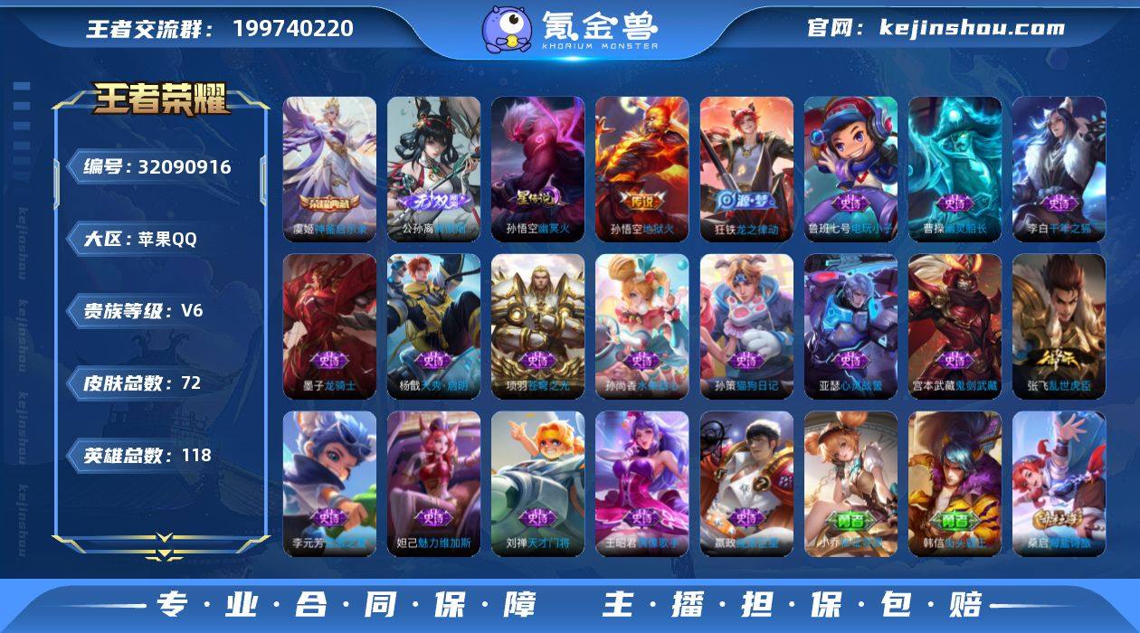 离恨烟·神鉴启示录·千魇归渊·神骥越千峰】【可二次】w17993-苹果Q-118英雄-72皮肤-2王者印记-92铭文-贵族积分1w【贵族6】【2典藏·2无双·1星传说·3传说·6按键·221幸运值】【因赛季更新游戏段付以上号为准!】 【荣耀典藏】:虞姬神鉴启示录,吕布千魇归渊 【无双皮肤】:李信问心剑,公孙离离恨烟 【星元皮肤】:孙悟空幽冥火 【传说皮肤】:云缨神骥越千峰,桑启鸣野蒿,孙悟空地狱火 【限定皮肤】:公孙离离恨烟,蔡文姬夏日便利店,狄仁杰阴阳师,赵云皇家上将,元歌无心,狄仁杰魔术师,项羽海滩派对,兰陵王金庭之子,裴擒虎擒涛扼浪,鲁班大师探海日志,桑启海盐诗旅,司空震地狱燃心,张良古海寻踪,鬼谷子天穹祈灯 【赛季限定】:兰陵王金庭之子,桑启海盐诗旅,裴擒虎擒涛扼浪,鲁班大师探海日志,张良古海寻踪,鬼谷子天穹祈灯,东皇太一噬灭天穹,亚瑟荣光之誓 【战令限定】:司空震地狱燃心,蔡文姬夏日便利店,兰陵王傩神司,莱西奥光弋星穹,明世隐往忆晖光,周瑜线条小狗,小乔线条小狗 【史诗皮肤】:钟馗锁墨魂,周瑜线条小狗,小乔线条小狗,兰陵王傩神司,莱西奥光弋星穹,狂铁龙之律动,蔡文姬夏日便利店,司空震地狱燃心,元歌无心,杨戬天秀启明,孙策猫狗日记,阿轲节奏热浪,李元芳逐浪之夏,刘禅天才门将,亚瑟心灵战警,张飞乱世虎臣,李白千年之狐,曹操幽灵船长,墨子龙骑士,妲己魅力维加斯,嬴政摇滚巨星,孙尚香水果甜心,宫本武藏鬼剑武藏,狄仁杰魔术师,王昭君偶像歌手,赵云皇家上将,项羽苍穹之光,鲁班七号电玩小子 【其他皮肤】:妲己线条小狗,蒙恬苍云破阵,安琪拉糖果风暴,虞姬溯影追猎,艾琳鹤鸣心笺,明世隐往忆晖光,亚瑟荣光之誓,姜子牙星梦巡礼,东皇太一噬灭天穹,鬼谷子天穹祈灯,后羿完美运算,张良古海寻踪,李元芳妄想特派,鲁班大师探海日志,太乙真人劲辣...