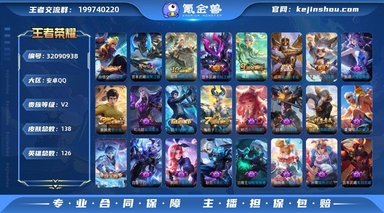 V2 1典藏 5传说 1星元 138皮肤 126英雄 【1水晶】孙悟空-全息碎影【5传说】宫本武藏-地狱之眼,后羿-黄金射手座,李元芳-飞鸢探春,桑启-鸣野蒿,后羿-神树通天【1星元】宫本武藏-幽冥之眼【24史诗】鬼谷子-五谷丰年,赵云-未来纪元,阿轲-节奏热浪,百里守约-特工魅影,妲己-女仆咖啡,妲己-魅力维加斯,狄仁杰-鹰眼统帅,貂蝉-圣诞恋歌,宫本武藏-鬼剑武藏,铠-曙光守护者,兰陵王-暗隐猎兽者,李元芳-逐浪之夏,吕布-末日机甲,裴擒虎-李小龙,司马懿-暗渊魔法,孙策-猫狗日记,孙尚香-水果甜心,夏侯惇-乘风破浪,小乔-缤纷独角兽,嬴政-摇滚巨星,嬴政-暗夜贵公子,张飞-乱世虎臣,甄姬-冰雪圆舞曲,弈星-万物之道