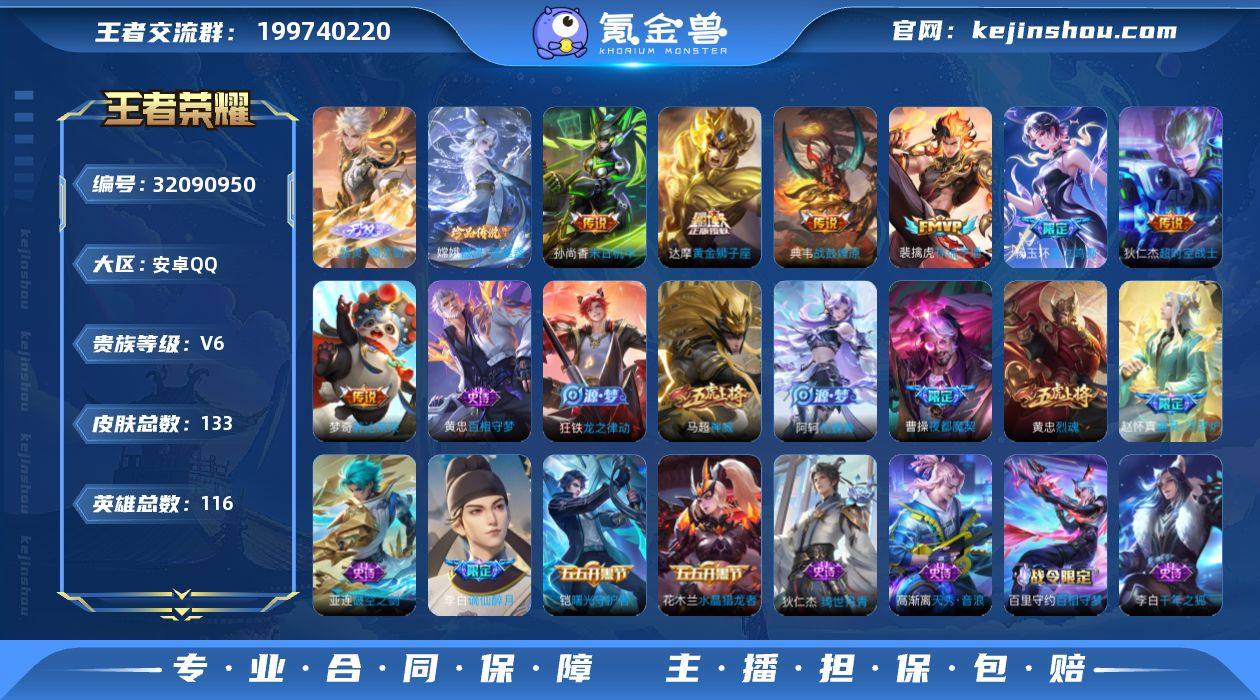 剑·器灵落星盏·愿照山河定·愿照众生和·愿照九州拓·愿照岁时盈·冰锋战神】【可二次】w17996-安卓Q-116英雄-133皮肤-王者印记-153铭文-贵族积分4w【贵族7】【1无双·1珍品·13传说·20按键·幸运值188】【因赛季更新游戏段付以上号为准!】 【英雄全皮】:敖隐全皮 【无双皮肤】:曜器灵螭龙剑 【珍品传说】:嫦娥器灵落星盏 【传说皮肤】:杨玉环星之鸣奏,司空震愿照山河定,妲己愿照众生和,澜愿照九州拓,虞姬愿照岁时盈,裴擒虎祥瑞亨通,王昭君映山客,桑启鸣野蒿,典韦战鼓燎原,达摩黄金狮子座,梦奇胖达荣荣,孙尚香末日机甲,狄仁杰超时空战士 【限定皮肤】:虞姬夏日便利店,姜子牙天穹之誓,李白谪仙醉月,狄仁杰阴阳师,赵云皇家上将,嬴政优雅恋人,狄仁杰魔术师,达摩沙漠行僧,项羽海滩派对,关羽冰锋战神,黄忠烈魂,苏烈千军破阵,鲁班大师探海日志,曹操夜都魔契,刘邦剑破天穹,周瑜熔金海岸 【年限皮肤】:司空震愿照山河定,妲己愿照众生和,澜愿照九州拓,虞姬愿照岁时盈 【赛季限定】:苏烈千军破阵,达摩沙漠行僧,鲁班大师探海日志,刘邦剑破天穹,姜子牙天穹之誓,东皇太一噬灭天穹,太乙真人谧流熔炉,钟馗虚灵犬护,亚瑟荣光之誓,牛魔星界战将,项羽九幽镇关 【战令限定】:虞姬夏日便利店,亚连破空之剑,孙悟空神迹守卫,百里守约百相守梦,老夫子百相守梦,孙膑茶境仙,马超访茗客,周瑜线条小狗 【史诗皮肤】:周瑜线条小狗,项羽九幽镇关,黄忠百相守梦,狂铁龙之律动,阿轲化蝶舞,狄仁杰绮世丹青,赵怀真器灵浮梦炉,孙膑茶境仙,牛魔星界战将,百里守约百相守梦,艾琳陌上桑,李白谪仙醉月,马可波罗星界特工,亚连破空之剑,黄忠怒海争锋,曹操夜都魔契,米莱狄完美假期,高渐离天秀音浪,澜赏金猎手,杨戬天秀启明,黄忠烈魂,马超神威,狄仁杰鹰眼统帅,伽罗箭羽风息,孙策猫狗...