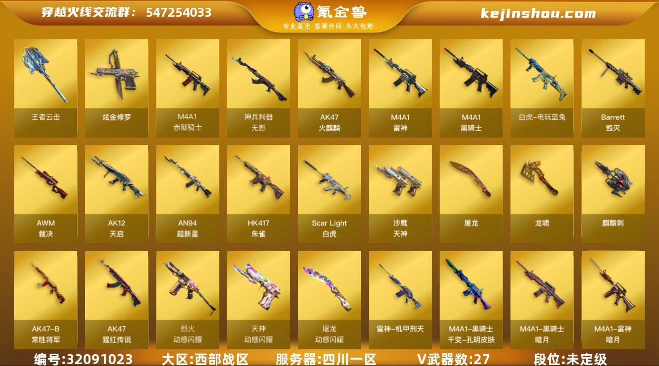 四川一区-30V-1王者武器数-1炫金武器数 【传说角色】:传说女帝 【热门武器】:Scar Light-白虎,HK417-朱雀,白虎-电玩蓝兔,M4A1-黑骑士*2,加特林-炼狱 【王者炫金武器】:王者云击,炫金修罗 【音效卡】:M4A1-黑骑士音效卡,Barrett-毁灭音效卡,Scar Light-白虎音效卡,Barrett-碧霄极光音效卡 【皮肤】:裁决-羽掣 皮肤,雷神-暗月,雷神-机甲刑天皮肤,雷神-化蛇 皮肤,火麒麟-雷神,火麒麟-平天大圣,火麒麟-心动糖果,毁灭-暗月,毁灭-黑大圣皮肤,毁灭-魔灵皮肤,M4A1-千变-孔明皮肤,黑骑士-暗月*2,战神-紫绶金章皮肤,AK47-B-常胜将军-曹操,炼狱-玩具枪皮肤,龙啸-青青莓果 皮肤 【角色】:鹰,零·纪元,战地猎狐,乔伊教练,暗夜-X,北极狐-X,初恋灵狐,芳心审判者,风暴女,嘉年华灵狐,兰-海滩派对,灵狐者-七夕宝贝,龙儿-小淘气,曼陀罗-X,曼陀罗-礼服,青霞仙子,蛇姬,斯沃特-X,蜀雪,铁骑荣耀,兔囡囡,樱-战斗天使 【人偶武器】:街机小灰机,AWM-灵狐-15周年嘉年华,海滩汪汪-巴雷特,迷你深渊冰龙*2,迷你裂空之翼*4,迷你牛魔王,迷你波特博士*7,迷你曼提柯尔,夺魂,迷你牛牛*3,迷你火种*5,深渊终结者手雷,迷你艾比,迷你巨石泰坦-魔花研究所 【暴走生化】:异变清道夫,双面神,超级对讲机 【挑战大师】:冰龙粉碎者-白马银枪,VEPR-12-金魔,机甲撕裂者III*2,试炼破坏者III,KAC-圣炎切割者III,神圣爆裂者-末日III,惩戒者III,VEPR-12-紫魔,VEPR-12-红魔 【英雄级武器】:AK47-火麒麟*2,M4A1-雷神,M4A1-黑骑士*2,AK12-天启,AN94-超新星,HK417-朱雀,Scar Light-白虎,无影-神兵利器,烈火-动感闪耀,AK-47-猩红传说,AK47-B-常胜将军,白虎-电玩蓝兔,机械迷城-穹宇,Barrett-毁灭,AWM-裁决,加特林-炼狱,沙鹰-天神,天神-动感闪耀,屠龙,龙啸,麒麟刺,屠龙-动...