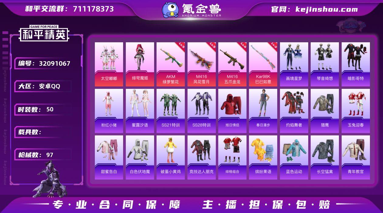 安卓 手Q-2粉装-6特效枪-0载具-2粉色飞行器-26442热力值-3王牌印记-50套装-97枪皮 QW263602 【热门品类】:套装-暗影哥特,套装-粉红小猪 【粉色套装】:粉装-太空嘟嘟,角色-绯穹魔姬 【粉色枪皮等级】:AKM-绿萝繁花(五级),M416-五爪金龙(四级),M416-风花雪月(五级),AKS-74U-森灵之息(五级),Kar98K-巳巳如意(三级),Mk14-福马献瑞(四级) 【粉色枪皮】:AKM-绿萝繁花,M416-五爪金龙,M416-风花雪月,AKS-74U-森灵之息,Kar98K-巳巳如意,Mk14-福马献瑞 【粉色飞行器】:炫彩糖果飞行器,太空嘟嘟飞行器 【粉色降落伞】:绝对恒星降落伞,梦幻火箭降落伞,筑梦精灵降落伞,垂柳戏鸭降落伞,太空嘟嘟降落伞,彩虹甜喵降落伞,闲梦青缨降落伞,炫彩糖果降落伞 【稀有套装】:套装-雪国风尚,套装-炫彩糖果,套装-蜜露汐语,套装-画境星梦,套装-琴音绮想,角色-月烬之祷 【稀有枪皮】:AUG-冰晶雪宝,AKM-星之信仰,SCAR-L-炫彩节奏,SCAR-L-玉兔迎春,M416-红色方程式,GROZA-异彩先驱,AUG-天降萌叽,QBZ-彩虹符号,M762-天降萌叽,M762-牛气冲天,AC-VAL-天降萌叽,AC-VAL-彩虹甜喵,蜜獾-天降萌叽,蜜獾-娇憨猪猪,ACE32-画境星梦,UZI-天降萌叽,UZI-娇憨猪猪,UMP45-极意拳锋,Vector-彩虹符号,汤姆逊-天降萌叽,汤姆逊-像素花束,MP5K-画境星梦,P90-飞驰魅影,Kar98K-彩虹符号,Kar98K-影袭,M24-影袭,M24-幻彩电音,SKS-炫彩节奏,SLR-娇憨猪猪,AMR-翩跹演武,M417-惊鸿侠骨,M200-惊鸿侠骨,M1加兰德-画境星梦,S686-千金淑猫,S1897-枪炮玫瑰,S1897-炫彩节奏,S12K-破晓战魂,S12K-娇憨猪猪,DBS-彩虹甜喵,DBS-甜心亚梦,AA12-G-画境星梦,SPAS-12-太空嘟嘟,M249-彩虹符号,M249-糯团青竹,DP-28-甜心亚梦,MG3-幻世战舞者,MG3-惊鸿侠骨,蝎式手枪-闲梦青缨,爆炸猎弓-惊鸿侠骨,平底锅-画境...