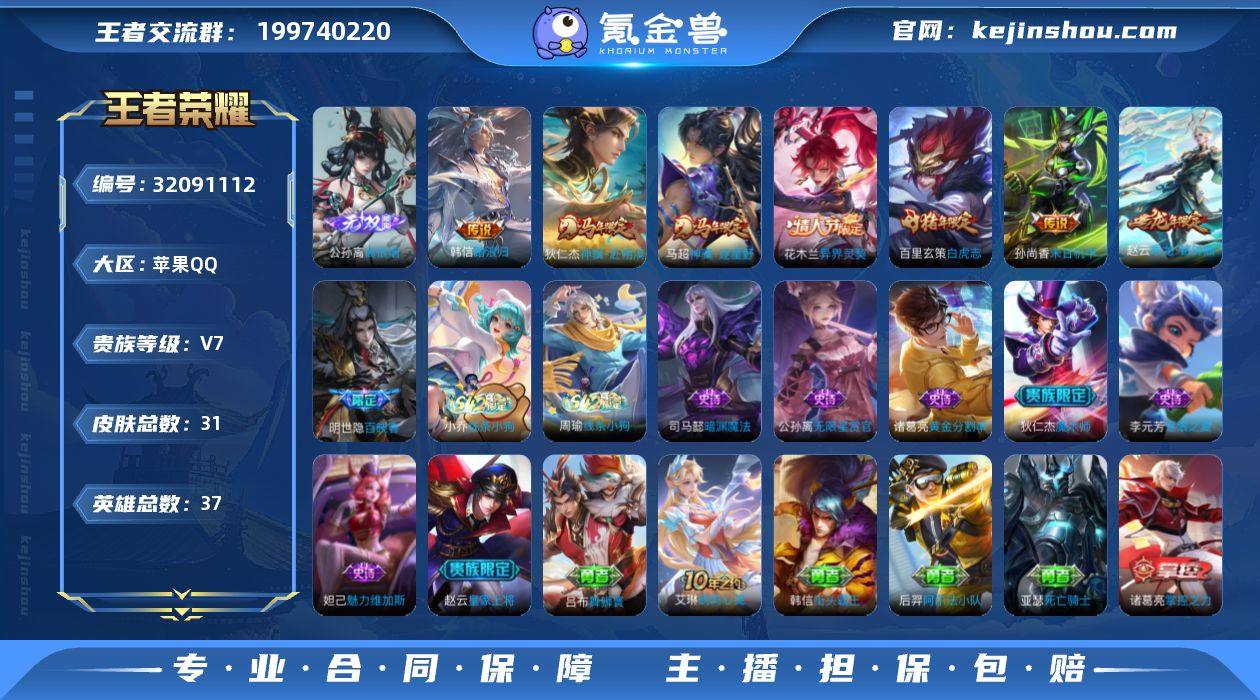 不可二次 苹果Q-V7-最强王者段位-37英雄-31皮肤-1无双-7传说-9史诗 QW263601 【无双皮肤】:公孙离离恨烟 【传说皮肤】:韩信踏浪归,狄仁杰神骥赴朔漠,马超神骥逐星野,花木兰异界灵契,赵云乘龙铭钟鼎,百里玄策白虎志,孙尚香末日机甲 【限定皮肤】:公孙离离恨烟,赵云皇家上将,狄仁杰魔术师,项羽海滩派对,百里玄策白虎志,赵云乘龙铭钟鼎 【年限皮肤】:百里玄策白虎志,赵云乘龙铭钟鼎 【战令限定】:周瑜线条小狗,小乔线条小狗 【史诗皮肤】:明世隐百晓客,周瑜线条小狗,小乔线条小狗,司马懿暗渊魔法,公孙离无限星赏官,李元芳逐浪之夏,诸葛亮黄金分割率,妲己魅力维加斯,狄仁杰魔术师,赵云皇家上将 【其他皮肤】:吕布舞狮寰,艾琳鹤鸣心笺,苏烈坚韧之力,诸葛亮掌控之力,王昭君幻想奇妙夜,后羿阿尔法小队,亚瑟死亡骑士,韩信街头霸王,项羽海滩派对,李信灼热之刃,米莱狄精准探案法,公孙离花间舞,马可波罗激情绿茵 【营地ID】:1773032356