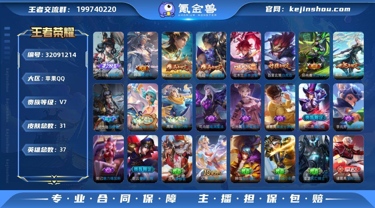 不可二次 苹果Q-V7-最强王者段位-37英雄-31皮肤-1无双-7传说-9史诗 QW263601 【无双皮肤】:公孙离离恨烟 【传说皮肤】:韩信踏浪归,狄仁杰神骥赴朔漠,马超神骥逐星野,花木兰异界灵契,赵云乘龙铭钟鼎,百里玄策白虎志,孙尚香末日机甲 【限定皮肤】:公孙离离恨烟,赵云皇家上将,狄仁杰魔术师,项羽海滩派对,百里玄策白虎志,赵云乘龙铭钟鼎 【年限皮肤】:百里玄策白虎志,赵云乘龙铭钟鼎 【战令限定】:周瑜线条小狗,小乔线条小狗 【史诗皮肤】:明世隐百晓客,周瑜线条小狗,小乔线条小狗,司马懿暗渊魔法,公孙离无限星赏官,李元芳逐浪之夏,诸葛亮黄金分割率,妲己魅力维加斯,狄仁杰魔术师,赵云皇家上将 【其他皮肤】:吕布舞狮寰,艾琳鹤鸣心笺,苏烈坚韧之力,诸葛亮掌控之力,王昭君幻想奇妙夜,后羿阿尔法小队,亚瑟死亡骑士,韩信街头霸王,项羽海滩派对,李信灼热之刃,米莱狄精准探案法,公孙离花间舞,马可波罗激情绿茵 【营地ID】:1773032356