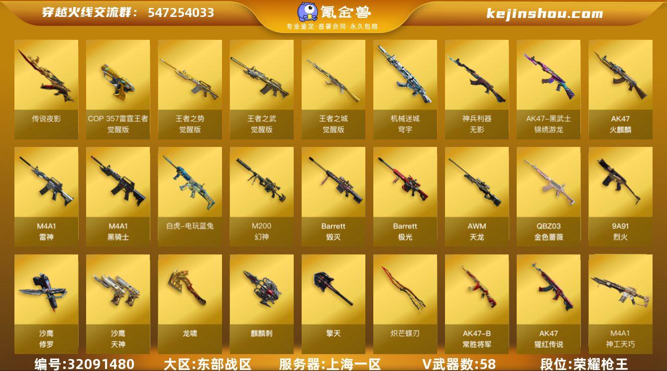 【ky6173】上海一区-69V-6王者武器数-0炫金武器数 【传说武器】:传说夜影 【热门武器】:传说夜影,QBZ03-金色蔷薇,M4A1-青龙,M200-幻神,白虎-电玩蓝兔,炼狱-迷你小钢,M4A1-黑骑士*2,沙鹰-修罗*3,炽芒蝶刃,黄金猫猫手套-白鲨 【音效卡】:M4A1-黑骑士音效卡,Barrett-毁灭音效卡,QBZ03-金色蔷薇音效卡,绝迹语音包 【皮肤】:M200-幻神-黄忠皮肤,雷神-暗月,雷神-星空,雷神-冠军之魄,M4A1-战神赵云,雷神-宇航兔皮肤,火麒麟-冠军之心,火麒麟-轻羽皮肤,火麒麟-战神关羽,火麒麟-盘古,火麒麟-白虎,火麒麟-大唐荣光,火麒麟-心动糖果,毁灭-暗月,毁灭耀金皮肤,毁灭-战神张飞,毁灭-风暴,毁灭-英雄计划 皮肤,M4A1-千变-孔明皮肤,黑骑士耀金皮肤,黑骑士-冠军之势,黑骑士-战神马超,烈火-熔核皮肤,战神-粉色甜心皮肤*2,战神-流金岁月皮肤*2,AK47-B-常胜将军-曹操,炼狱-玩具枪皮肤,修罗-冠军之魂,天神-宇航兔皮肤,麒麟刺-萌杀皮肤 【角色】:魅影,兰-巾帼英雄,晴雅,雨墨,华,堕落女神,乔伊教练,修道士,云海玲珑,空,暗夜-X,北极狐-X,初恋灵狐,芳心审判者,风暴女,虎妞,嘉年华灵狐,灵狐者-X,龙儿,曼陀罗-X,曼陀罗-礼服,萌儿,潘多拉-X,潘多拉-甜心教官,蛇姬,斯沃特-X,蜀雪,兔囡囡,幽,职业选手 【人偶武器】:天龙-曼陀罗,火麒麟-灵狐,炼狱-迷你小钢,AWM-灵狐-15周年嘉年华,COP-旗袍,迷你波特博士,迷你曼提柯尔,夺魂,迷你火种,迷你超能女侍 【暴走生化】:超级对讲机 【挑战大师】:AK47-冰龙粉碎者,激光毁灭者III-白马银枪,试炼破坏者III 【英雄级武器】:AK47-火麒麟,M4A1-雷神,M4A1-黑骑士*2,M4A1-青龙,M4A1-神工天巧,无影-神兵利器,黑武士-锦绣游龙,QBZ03-金色蔷薇,9A91-烈火,烈火-动感闪耀,王者之武-觉醒版,王者之势-觉醒版,AK-47-...