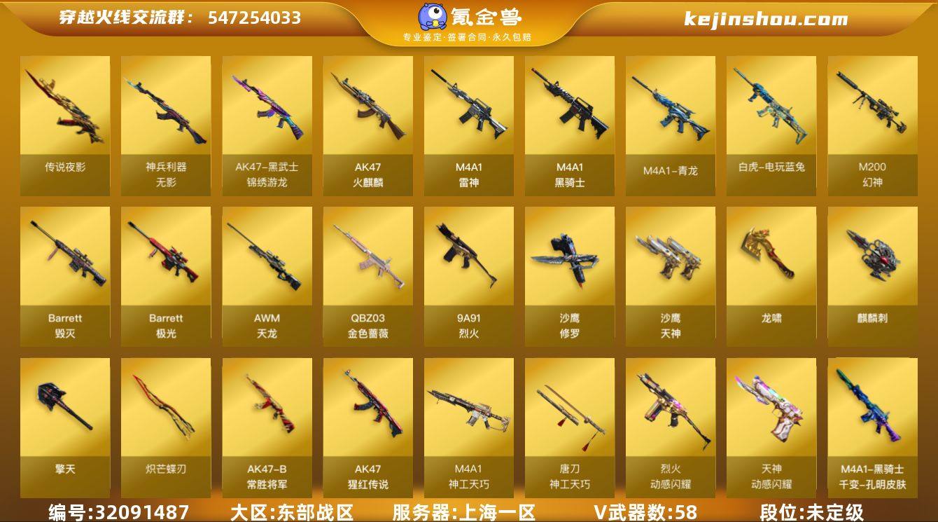上海一区-69V-6王者武器数-0炫金武器数 【传说武器】:传说夜影 【热门武器】:传说夜影,QBZ03-金色蔷薇,M4A1-青龙,M200-幻神,白虎-电玩蓝兔,炼狱-迷你小钢,M4A1-黑骑士*2,沙鹰-修罗*3,炽芒蝶刃,黄金猫猫手套-白鲨 【音效卡】:M4A1-黑骑士音效卡,Barrett-毁灭音效卡,QBZ03-金色蔷薇音效卡,绝迹语音包 【皮肤】:M200-幻神-黄忠皮肤,雷神-暗月,雷神-星空,雷神-冠军之魄,M4A1-战神赵云,雷神-宇航兔皮肤,火麒麟-冠军之心,火麒麟-轻羽皮肤,火麒麟-战神关羽,火麒麟-盘古,火麒麟-白虎,火麒麟-大唐荣光,火麒麟-心动糖果,毁灭-暗月,毁灭耀金皮肤,毁灭-战神张飞,毁灭-风暴,毁灭-英雄计划 皮肤,M4A1-千变-孔明皮肤,黑骑士耀金皮肤,黑骑士-冠军之势,黑骑士-战神马超,烈火-熔核皮肤,战神-粉色甜心皮肤*2,战神-流金岁月皮肤*2,AK47-B-常胜将军-曹操,炼狱-玩具枪皮肤,修罗-冠军之魂,天神-宇航兔皮肤,麒麟刺-萌杀皮肤 【角色】:魅影,兰-巾帼英雄,晴雅,雨墨,华,堕落女神,乔伊教练,修道士,云海玲珑,空,暗夜-X,北极狐-X,初恋灵狐,芳心审判者,风暴女,虎妞,嘉年华灵狐,灵狐者-X,龙儿,曼陀罗-X,曼陀罗-礼服,萌儿,潘多拉-X,潘多拉-甜心教官,蛇姬,斯沃特-X,蜀雪,兔囡囡,幽,职业选手 【人偶武器】:天龙-曼陀罗,火麒麟-灵狐,炼狱-迷你小钢,AWM-灵狐-15周年嘉年华,COP-旗袍,迷你波特博士,迷你曼提柯尔,夺魂,迷你火种,迷你超能女侍 【暴走生化】:超级对讲机 【挑战大师】:AK47-冰龙粉碎者,激光毁灭者III-白马银枪,试炼破坏者III 【英雄级武器】:AK47-火麒麟,M4A1-雷神,M4A1-黑骑士*2,M4A1-青龙,M4A1-神工天巧,无影-神兵利器,黑武士-锦绣游龙,QBZ03-金色蔷薇,9A91-烈火,烈火-动感闪耀,王者之武-觉醒版,王者之势-觉醒版,AK-47-猩红传说*2...
