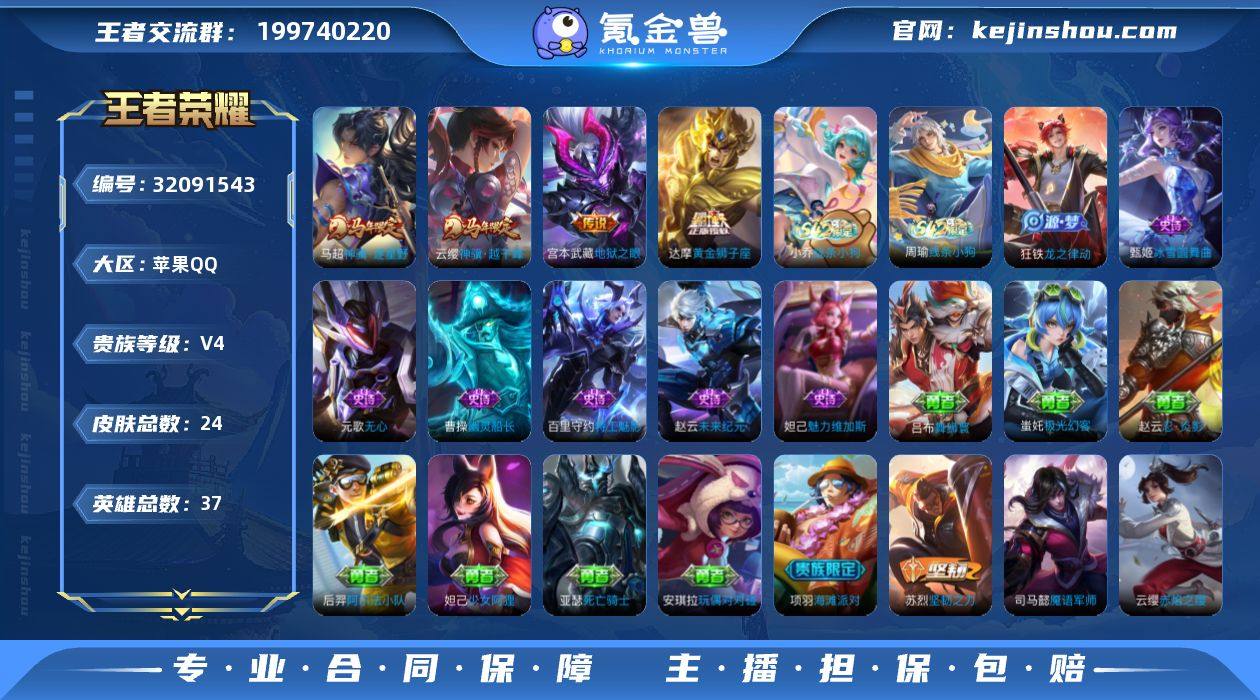 苹果Q-V4-至尊星耀II段位-37英雄-24皮肤-4传说-8史诗 【传说皮肤】:云缨神骥越千峰,马超神骥逐星野,达摩黄金狮子座,宫本武藏地狱之眼 【限定皮肤】:元歌无心,项羽海滩派对 【战令限定】:周瑜线条小狗,小乔线条小狗 【史诗皮肤】:周瑜线条小狗,小乔线条小狗,狂铁龙之律动,元歌无心,百里守约特工魅影,曹操幽灵船长,妲己魅力维加斯,甄姬冰雪圆舞曲,赵云未来纪元 【其他皮肤】:吕布舞狮寰,蚩奼极光幻客,苏烈坚韧之力,后羿阿尔法小队,亚瑟死亡骑士,妲己少女阿狸,安琪拉玩偶对对碰,赵云忍炎影,项羽海滩派对,云缨赤焰之缨,司马懿魇语军师 【营地ID】:1511401882