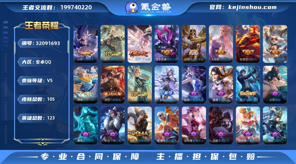 贵族等级:V5 典藏皮肤数:1 珍品无双皮肤数:0 无双皮肤数:0 珍品传说皮肤数:0 传说皮肤数:7 史诗皮肤数:24 皮肤数:105 英雄数:123 段位:绝世王者 卖家说:QQ皇冠账号