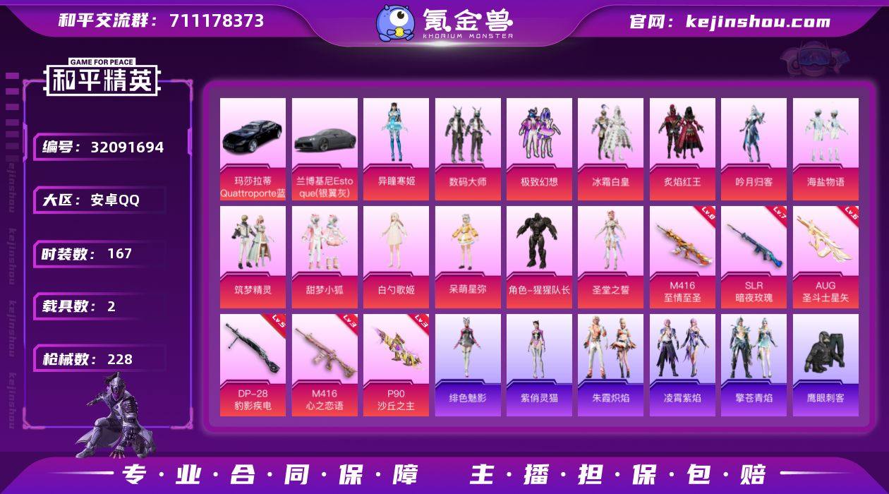 【1629】安卓 手Q-13粉装-7特效枪-2载具-4粉色飞行器-75103热力值-9王牌印记-167套装-228枪皮 【热门品类】:套装-小丑鱼,套装-龟仙人 【粉色套装】:粉装-数码大师,粉装-极致幻想,粉装-冰霜白皇,粉装-炙焰红王,粉装-吟月归客,粉装-海盐物语,粉装-筑梦精灵,粉装-甜梦小狐,角色-白勺歌姬,角色-呆萌星弥,角色-猩猩队长,角色-圣堂之誓,角色-异瞳寒姬 【粉色枪皮等级】:M416-心之恋语(三级),M416-至情至圣(八级),AUG-圣斗士星矢(六级),P90-沙丘之主(三级),Mk14-福马献瑞(四级),SLR-暗夜玫瑰(七级),DP-28-豹影疾电(五级) 【粉色载具】:兰博基尼Estoque(银翼灰),玛莎拉蒂Quattroporte(夜幕蓝) 【粉色枪皮】:M416-心之恋语,M416-至情至圣,AUG-圣斗士星矢,P90-沙丘之主,Mk14-福马献瑞,SLR-暗夜玫瑰,DP-28-豹影疾电 【粉色飞行器】:炫彩糖果飞行器,天之羽翼飞行器,璀璨巨星飞行器,沙丘之主天马 【粉色降落伞】:幻影战神降落伞,百万伏特降落伞,童趣迷兔降落伞,焦糖拿铁降落伞,炙焰牛王降落伞,暗夜鎏金降落伞,第五大道降落伞,仲夏莫吉托降落伞,天星战神降落伞,炎氏战神降落伞,未来歌姬降落伞,超新星降落伞,莲影清波降落伞,沙丘之主降落伞,星梦奇缘降落伞,魔法神域降落伞,忍者神龟降落伞,异瞳寒姬降落伞,炫彩糖果降落伞 【稀有套装】:套装-龟仙人,套装-雪国风尚,套装-炫彩糖果,套装-马上有钱,角色-灵公主,套装-朱霞炽焰,套装-凌霄紫焰,套装-擎苍青焰,角色-绯色魅影,角色-紫俏灵猫 【稀有枪皮】:AKM-夜灯,AKM-彩虹符号,AKM-星之彼岸,AKM-灼热熔岩,AKM-萌趣颜团子,AKM-虎虎生威,AKM-龙的传人,M16A4-幻世战舞者,M16A4-甜心亚梦,SCAR-L-夜灯,SCAR-L-幽秘魅影,SCAR-L-炫彩节奏,SCAR-L-玉兔迎春,SCAR-L-碧影闪光,M416-糯团青竹,M416-红色方程式...
