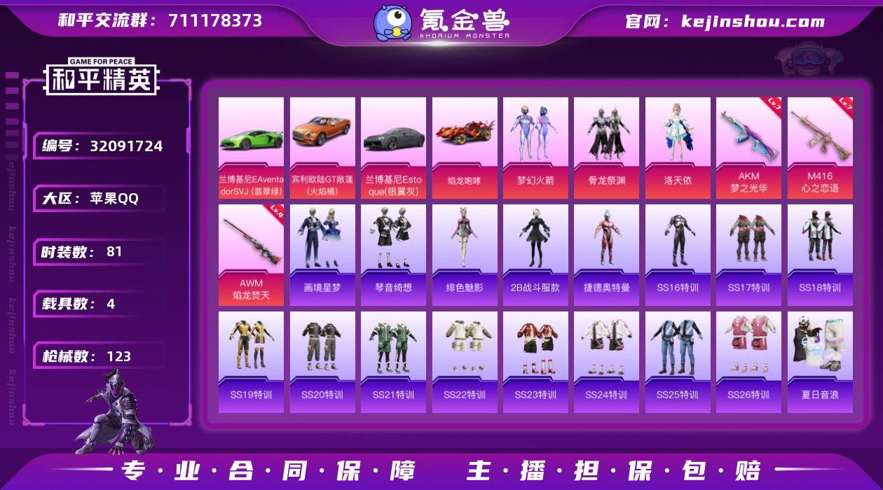 苹果手Q S2-DWF040【3粉装3特效枪4载具 巡查员上衣/2B战斗服款/火箭/骨龙祭渊/洛天依/绯色魅影/画境星梦/琴音绮想/霜刃之御/捷德奥特曼】38902热力值-13王牌印记-81套装-123枪皮 【热门品类】: 巡查员上衣/2B战斗服款/火箭/骨龙祭渊/洛天依 【粉色枪皮等级】:AKM-梦之光华(七级),M416-心之恋语(七级),AWM-焰龙焚天(四级) 【粉色载具】:宾利欧陆GT敞篷(火焰橘),兰博基尼Aventador SVJ(翡翠绿),兰博基尼Estoque(银翼灰),焰龙咆哮 【粉色