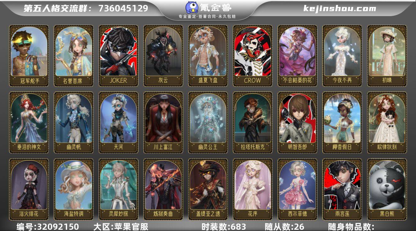 苹果官服双虚妄42金超多皮肤 犹格・索托斯之使,摩涅莫绪涅之梦,最高品质随机,荧,"华生小姐",幽灵帆,雨宫莲,JOKER,欧律狄刻,石榴碟小姐,恒梦,福尔摩斯,椰香假日,川上富江,盖提亚之遗,盛夏飞盘,拉塔托斯克,溯光,垂泪的神女,瑶影,"鬼烛",冠军舵手,天河,西尔菲德,不会枯萎的花,名誉首席,炼狱奏曲,海盐特调,明智吾郎,CROW,黑白熊,灵犀妙探,浴火绯花,司药,限定,幽灵公主,初晴,剧场主持,灰云,今夜不再,花序,采风的仙灵,不合时宜的后备者,自由之爱,限定,死生之谕,限定,片刻闲暇,辉锑矿,小明星,采集速巡,OPH.LILY,"有机磷",芳泽霞,VIOLET,"膨化",蛙里奥,思明,布朗熊,OPH.NAIB,蓝调阿拉丁,光学镜面,限定,动力芯,填海平,墨韵,OPH.Q1,乔苓,吟游诗人,伊布,刘枭,拂晓女士,慵懒的兔先生,坂本龙司,SKULL,阿瓦尔的战车,水球救生,炮弹飞船,熄灭的太阳,澄明的理性,弄臣,李天辰,桃乐丝,异动指针,银骑士,最原终一,"伊始新篇",收藏品,噩之牙,祖祖,噬恶之渊,"裁缝夫人",被时间遗忘的男孩,善恶的本性,应许之日,苗木诚,蛋小黄的好朋友,湖中影,迷迭香,Chef K,审判之翎,沙滩漂移,可妮兔,菲丽丝,踏莎行,善忘的海马体,追踪专家,纸翼小姐,清洁翼,咫尺微光,江户川乱步,温暖的平安夜,多色印刷,黑天鹅之羽,新岛真,QUEEN,雾切响子,梅菱丽,绿纹大触,高卷杏,PANTHER,流离的月光,佐仓双叶,NAVI,七海千秋,纸心,莎莉,水晶烛台,聚光灯下,吉尔达,海女巫,彼岸,融化的泪琥珀,衣帽架先生,桃面书生,梦之使者,"朝圣者",冰中蝶,"绯",警醒的龟先生,考古教授,发明家,衔尾蛇,魔音回响,黑玫瑰,江之岛盾子,女高音,"宴舞",夜光杯,校对人,西部大亨,霰,蓝釉先生,校监夫人,荒野女巫,"亡灵",潘塔龙,华生医...