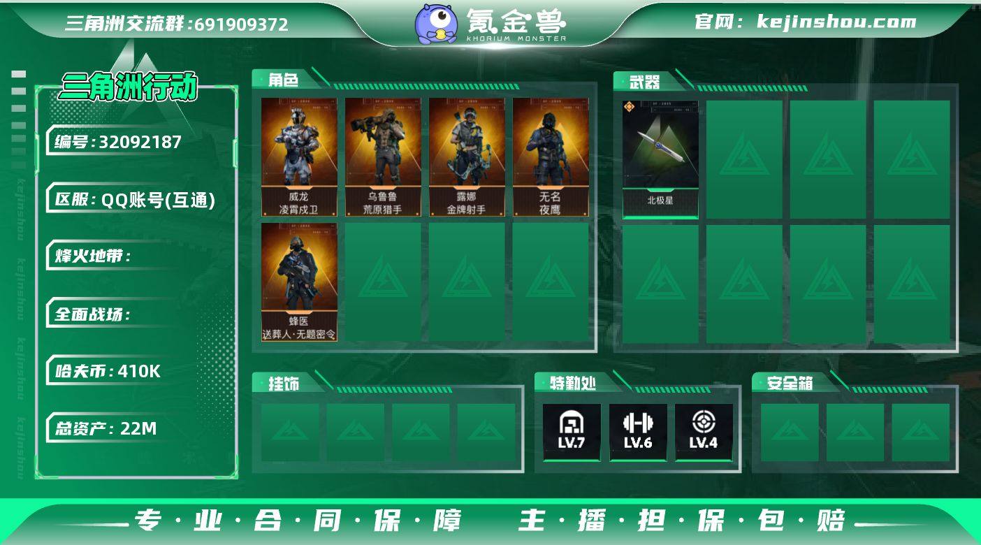S1369 总资产22M,哈夫币41w,近战2 枪皮数量258,威龙-凌霄戍卫/乌鲁鲁-荒原猎手/露娜-金牌射手/无名-夜鹰/蜂医-送葬人无题密令,近战-北极星,战场等级21上等兵, 行动等级60黑鹰,安全箱等时效性道具请以游戏内数据为准,详情请看图