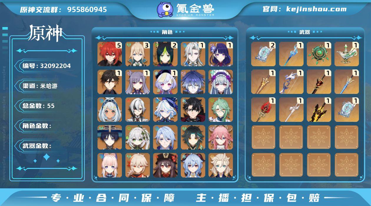 邮箱: 未绑定 总黄数: 55 冒险等级: 60 5命金色角色: 五命迪卢克 3命金色角色: 三命琴 2命金色角色: 二命提纳里 1命金色角色: 一命七七,一命刻晴,一命钟离,一命雷电将军,一命那维莱特 0命金色角色: 枫原万叶,达达利亚,莫娜,阿贝多,甘雨,魈,胡桃,珊瑚宫心海,八重神子,神里绫人,纳西妲,流浪者,迪希雅,白术,莱欧斯利,芙宁娜,阿蕾奇诺,玛拉妮,梦见月瑞希,菲林斯 2精武器: 四风原典 1精武器: 四风原典,风鹰剑,无工之剑,护摩之杖,苍古自由之誓,赤角石溃杵,若水,圣显之钥,千夜浮梦,碧落之珑,静水流涌之辉