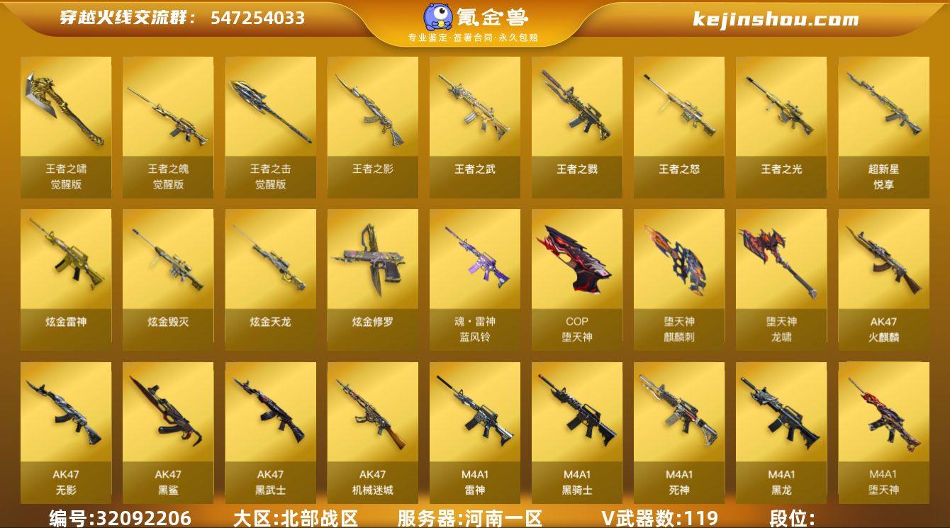 北部战区(河南一区)ys【爆破生化号】119v【M200-幻神,竞技荣光套装,堕天神套装,QBZ03-金色蔷薇,AWM-裁决,M4A1-青龙,6烈龙+4盘龙+3炼狱+斯泰尔-蝴蝶+5黑骑士,破空枪刃-夜魔,Colt1911-大黄蜂】10王者【王者之影,王者之戮,王者之魄,王者之武,王者之光,王者之怒,王者之击,王者之啸,超新星-悦享】5炫金【炫金雷神,炫金毁灭,炫金天龙,炫金修罗】4角色【电竞教官-云悠悠,迷迭香,魅影,王者-零】6音效【M4A1-雷神音效卡,AK47-火麒麟音效卡,Barrett-毁灭音效卡,M4A1-黑骑士音效卡】24皮【雷神-星空,毁灭-星空,火麒麟-CFS2018,天龙-CF STAR,雷神-虎将,火麒麟-华夏之心,屠龙-荣耀之锋,毁灭-冠军之怒,火麒麟-AG战队,修罗-CF STAR,雷神-荣耀之魄,火麒麟-CF STAR】小人物枪【火麒麟-灵狐】 截图展示段位不代表实际段位 如赛季更新等不可抗拒因素发生变化、时限道具不保证所剩时间