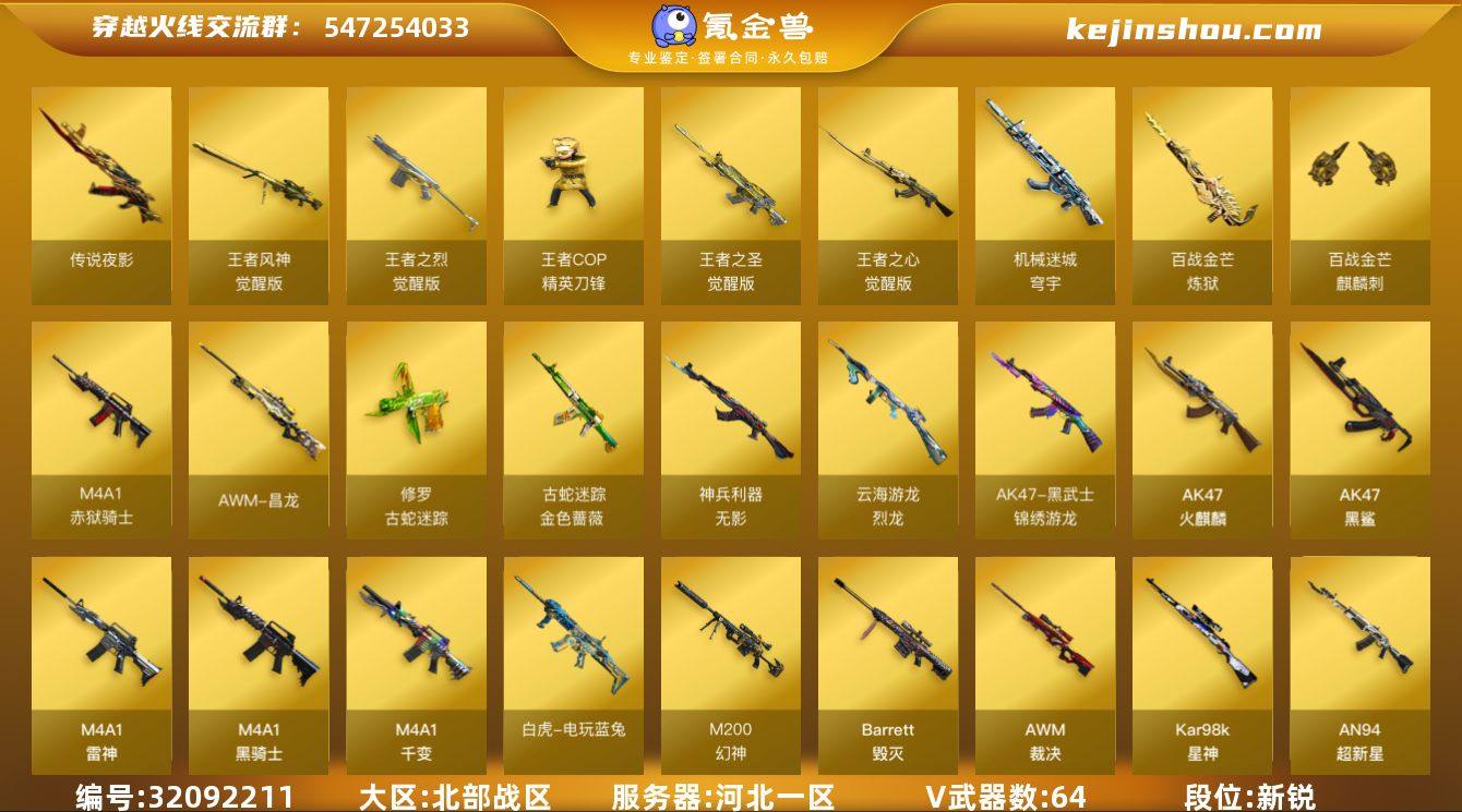 【ky6225】河北一区-73V-5王者武器数-0炫金武器数 【传说武器】:传说夜影 【热门武器】:传说夜影,QBZ03-金色蔷薇,M200-幻神,金色蔷薇-古蛇迷踪,修罗-古蛇迷踪,死亡之眼,白虎-电玩蓝兔,Kar98K-星神,Cat-刀锋,炼狱-迷你小钢,M4A1-黑骑士,加特林-炼狱*3,沙鹰-修罗*4,炽芒蝶刃,金刚伞 【音效卡】:M4A1-黑骑士音效卡,沙鹰-修罗-盛典舞曲音效卡*2,Barrett-碧霄极光音效卡*3,炼狱-百战金芒-庆典舞曲音效卡,火线妹语音包 【皮肤】:幻神-电流骇客 皮肤,幻神-星火小队签名臻藏版 皮肤,金色蔷薇-电竞之星 皮肤,星神-漫游,雷神-暗月,雷神-耀金皮肤,雷神-R.LGD-CFPLS18冠军,雷神-维纳斯皮肤,M4A1-雷神-新春神龙皮肤,雷神-源计划2.0专属 皮肤,M4A1-再燃火线,雷神-神秘按键 皮肤,火麒麟-轻羽皮肤,火麒麟-平天大圣,火麒麟-百城,火麒麟-心动糖果,毁灭-暗月,毁灭-黑大圣皮肤,毁灭-黑曼巴 皮肤,毁灭-虹光风暴 皮肤,毁灭-英雄计划 皮肤,黑龙-能量核心,黑骑士-冠军之势,黑骑士-电玩青兔皮肤,无影-神兵利器 皮肤,炼狱-月 皮肤,屠龙-荣耀之锋,屠龙-春桃 皮肤,龙啸-醒狮 皮肤,轻型军用手斧-再燃火线,擎天-蒸汽钟表 皮肤,麒麟刺-萌杀皮肤,麒麟刺-月皮肤 【角色】:关小雨,晴雅,零·纪元,战地猎狐,王者零-华冠丽服,王者潘多拉,蛇隐宗,奇洋探员,乔伊教练,云海玲珑,葵-阿尔法武装,幻面灵狐,暗夜-X,初恋灵狐,电竞少女,风暴女,虎妞,嘉年华灵狐,荆棘玫瑰,娟娟,卡塔琳娜,兰-空鹰,兰-新年限定,兰妹妹,猎狐者-追月,0号玩家,灵狐-花神,灵狐者-X,流浪蔷薇,曼陀罗-X,曼陀罗-礼服,玫瑰花神,萌儿,女主播,潘多拉-X,潘多拉-甜心教官,潜龙队-X,赛斯-X,蛇姬,斯沃特-X,蜀雪,铁骑荣耀,兔囡囡,维纳斯,雪莉杨-摸金校尉,夜玫瑰-幻能朋克,樱-战斗天使,游珑儿...