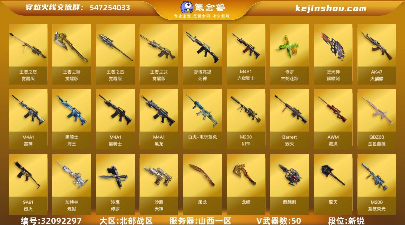 山西一区-55V-4王者武器数-0炫金武器数 【传说角色】:传说艾莉莎 【热门武器】:QBZ03-金色蔷薇,M200-幻神,修罗-古蛇迷踪,M200-竞技荣光,白虎-电玩蓝兔,M4A1-黑骑士,加特林-炼狱,COP-白鲨,沙鹰-修罗*2 【音效卡】:M4A1-黑骑士音效卡,Barrett-毁灭音效卡,死神-雪域霜狐-怀旧音效卡 【皮肤】:幻神-宠儿-2021MVP,M200-幻神-荣耀世冠白鲨,幻神-AG-CFPL S24冠军 皮肤,QBZ03-荣耀世冠白鲨,裁决-巅峰荣耀 皮肤,裁决-羽掣 皮肤,雷神-星空,雷神-虎将,雷神-传奇N9,M4A1-战神赵云,雷神-R.LGD-CFPLS18冠军,雷神-宇航兔皮肤,雷神-源计划2.0专属 皮肤,雷神-化蛇 皮肤,火麒麟-华夏之心*2,火麒麟-心动糖果,毁灭-星空,毁灭-黑大圣皮肤*2,毁灭-雪域霜狐 皮肤,黑龙-能量核心,M4A1-黑龙-361,黑骑士耀金皮肤,黑骑士-CFS2021,AK47-B-常胜将军-孙权,龙啸-蛇姬 皮肤,擎天-冠军之击 【角色】:战地猎狐,雪域霜狐,蛇隐宗,乔伊教练,修道士,初恋灵狐,嘉年华灵狐,娟娟,兰-新年限定,0号玩家,蛇姬,斯沃特-X 【人偶武器】:COP-白鲨,夺魂,迷你牛牛,生化手雷-机甲核心*2,迷你超能女侍 【暴走生化】:双面神,超级对讲机 【英雄级武器】:AK47-火麒麟*2,M4A1-黑龙,M4A1-雷神,M4A1-黑骑士,死神-雪域霜狐,QBZ03-金色蔷薇,9A91-烈火,王者之武-觉醒版,AK-47-猩红传说,黑骑士-海王,白虎-电玩蓝兔,Barrett-毁灭,AWM-裁决,M200-幻神,M200-竞技荣光,王者之怒-觉醒版,加特林-炼狱,沙鹰-修罗*2,沙鹰-天神,柯尔特-竞技荣光,修罗-古蛇迷踪,屠龙*2,龙啸,麒麟刺-堕天神,擎天,麒麟刺,擎天-竞技荣光,王者之啸-觉醒版,王者之击-觉醒版,高爆手雷-堕天神,高爆手雷-竞技荣光*4,手雷-动感闪耀,高爆手雷-古蛇迷踪,闪光弹-雷霆,闪光弹-堕天神,闪光弹-竞技荣光*4,烟雾弹-堕天神,...