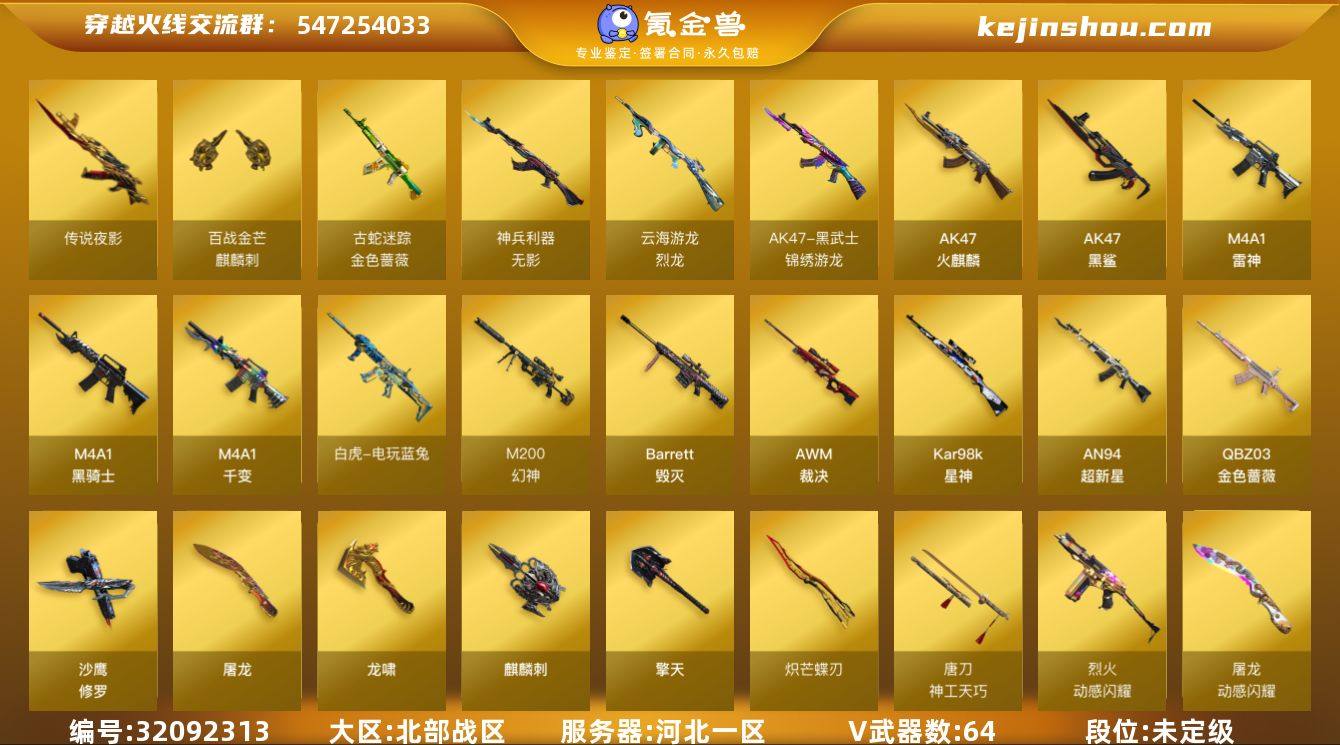 河北一区-73V-5王者武器数-0炫金武器数 【传说武器】:传说夜影 【热门武器】:传说夜影,QBZ03-金色蔷薇,M200-幻神,金色蔷薇-古蛇迷踪,修罗-古蛇迷踪,死亡之眼,白虎-电玩蓝兔,Kar98K-星神,Cat-刀锋,炼狱-迷你小钢,M4A1-黑骑士,加特林-炼狱*3,沙鹰-修罗*4,炽芒蝶刃,金刚伞 【音效卡】:M4A1-黑骑士音效卡,沙鹰-修罗-盛典舞曲音效卡*2,Barrett-碧霄极光音效卡*3,炼狱-百战金芒-庆典舞曲音效卡,火线妹语音包 【皮肤】:幻神-电流骇客 皮肤,幻神-星火小队签名臻藏版 皮肤,金色蔷薇-电竞之星 皮肤,星神-漫游,雷神-暗月,雷神-耀金皮肤,雷神-R.LGD-CFPLS18冠军,雷神-维纳斯皮肤,M4A1-雷神-新春神龙皮肤,雷神-源计划2.0专属 皮肤,M4A1-再燃火线,雷神-神秘按键 皮肤,火麒麟-轻羽皮肤,火麒麟-平天大圣,火麒麟-百城,火麒麟-心动糖果,毁灭-暗月,毁灭-黑大圣皮肤,毁灭-黑曼巴 皮肤,毁灭-虹光风暴 皮肤,毁灭-英雄计划 皮肤,黑龙-能量核心,黑骑士-冠军之势,黑骑士-电玩青兔皮肤,无影-神兵利器 皮肤,炼狱-月 皮肤,屠龙-荣耀之锋,屠龙-春桃 皮肤,龙啸-醒狮 皮肤,轻型军用手斧-再燃火线,擎天-蒸汽钟表 皮肤,麒麟刺-萌杀皮肤,麒麟刺-月皮肤 【角色】:关小雨,晴雅,零·纪元,战地猎狐,王者零-华冠丽服,王者潘多拉,蛇隐宗,奇洋探员,乔伊教练,云海玲珑,葵-阿尔法武装,幻面灵狐,暗夜-X,初恋灵狐,电竞少女,风暴女,虎妞,嘉年华灵狐,荆棘玫瑰,娟娟,卡塔琳娜,兰-空鹰,兰-新年限定,兰妹妹,猎狐者-追月,0号玩家,灵狐-花神,灵狐者-X,流浪蔷薇,曼陀罗-X,曼陀罗-礼服,玫瑰花神,萌儿,女主播,潘多拉-X,潘多拉-甜心教官,潜龙队-X,赛斯-X,蛇姬,斯沃特-X,蜀雪,铁骑荣耀,兔囡囡,维纳斯,雪莉杨-摸金校尉,夜玫瑰-幻能朋克,樱-战斗天使,游珑儿 【人偶武器...