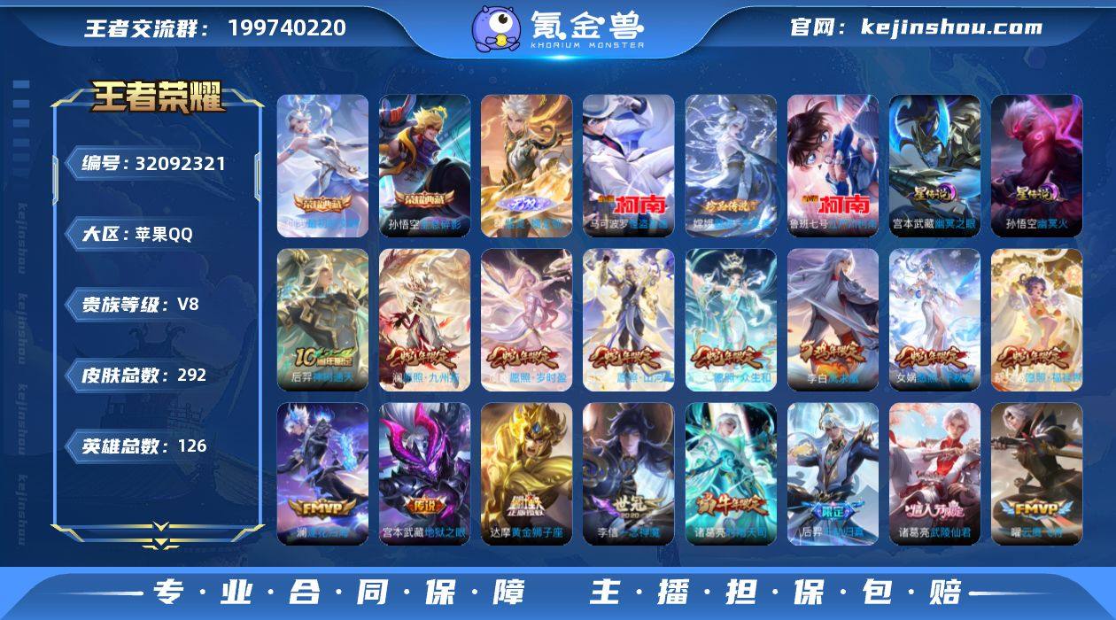 苹果Q-V8-至尊星耀III段位-126英雄-292皮肤-2典藏皮肤-1无双-3珍品传说-28传说-90史诗【英雄全皮】:孙权全皮,司空震全皮,空空儿全皮,影全皮【荣耀典藏】:孙悟空全息碎影,伽罗最初的交响【无双皮肤】:曜器灵螭龙剑【珍品传说】:嫦娥器灵落星盏,鲁班七号江户川柯南,马可波罗怪盗基德【传说皮肤】:后羿神树通天,后羿千劫归真,司空震愿照山河定,女娲愿照千秋盛,妲己愿照众生和,澜愿照九州拓,蔡文姬愿照福禄聚,虞姬愿照岁时盈,云缨幻光神枪,裴擒虎祥瑞亨通,桑启鸣野蒿,澜逐花归海,不知火舞绯月行,赵云淬星耀世,李元芳飞鸢探春,诸葛亮时雨天司,虞姬启明星使,曜云鹰飞将,李信一念神魔,刘备时之恋人,张良黄金白羊座,干将莫邪久胜战神,达摩黄金狮子座,后羿黄金射手座,诸葛亮武陵仙君,李白凤求凰,宫本武藏地狱之眼,孙悟空地狱火【限定皮肤】:姜子牙天穹之誓,狄仁杰阴阳师,赵云皇家上将,孙尚香蔷薇恋人,鲁班七号狮舞东方,庄周高山流水,阿轲迷踪丽影,周瑜赤莲之焰,元歌云间偶戏,元歌无心,夏侯惇朔风刀,典韦蓝屏警告,马可波罗暗影游猎,马可波罗山海玄木吟,狄仁杰魔术师,狄仁杰万华元夜,达摩沙漠行僧,项羽海滩派对,老夫子醍醐杖,...