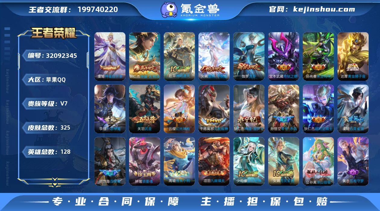 贵族等级:V7 典藏皮肤数:1 珍品无双皮肤数:0 无双皮肤数:0 珍品传说皮肤数:0 传说皮肤数:15 史诗皮肤数:86 皮肤数:325 英雄数:128 段位:荣耀王者 卖家说:射手在榜4个万战