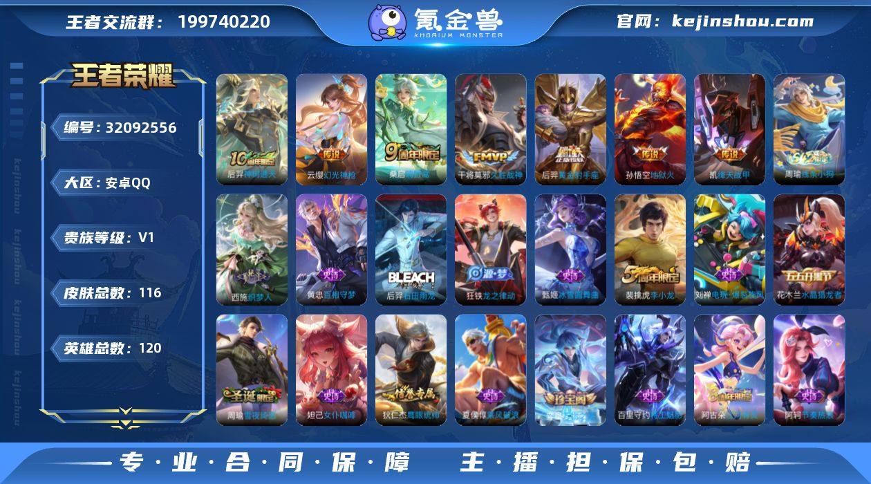 【4887】安卓Q-V0-至尊星耀III段位-120英雄-116皮肤-7传说-30史诗 【传说皮肤】:后羿神树通天,云缨幻光神枪,桑启鸣野蒿,铠绛天战甲,干将莫邪久胜战神,后羿黄金射手座,孙悟空地狱火 【限定皮肤】:姜子牙天穹之誓,狄仁杰阴阳师,甄姬游园惊梦,裴擒虎李小龙,裴擒虎擒涛扼浪,鲁班大师探海日志,桑启海盐诗旅,阿古朵江河有灵,张良古海寻踪,鬼谷子天穹祈灯,沈梦溪龙舞盛年,刘邦剑破天穹,程咬金群星魔术团,刘备异域游侠,周瑜熔金海岸 【赛季限定】:桑启海盐诗旅,裴擒虎擒涛扼浪,鲁班大师探海日志,张良古海寻踪,鬼谷子天穹祈灯,刘邦剑破天穹,姜子牙天穹之誓,东皇太一噬灭天穹,太乙真人谧流熔炉,钟馗虚灵犬护,甄姬逆浪荇歌,亚瑟荣光之誓 【战令限定】:周瑜线条小狗 【史诗皮肤】:周瑜线条小狗,西施织梦人,黄忠百相守梦,后羿石田雨龙,狂铁龙之律动,弈星万物之道,周瑜雪夜绮愿,阿古朵江河有灵,刘禅电玩爆裂旋风,沈梦溪月团寄思,裴擒虎李小龙,狄仁杰鹰眼统帅,伽罗箭羽风息,阿轲节奏热浪,李元芳逐浪之夏,刘禅天才门将,百里守约特工魅影,雅典娜冰冠公主,亚瑟心灵战警,甄姬游园惊梦,兰陵王暗隐猎兽者,夏侯惇乘风破浪,花木兰水晶猎龙者,墨子金属风暴,妲己女仆咖啡,妲己魅力维加斯,孙尚香水果甜心,宫本武藏鬼剑武藏,甄姬冰雪圆舞曲,貂蝉圣诞恋歌,赵云未来纪元 【其他皮肤】:鲁班七号班班快跑,虞姬溯影追猎,艾琳鹤鸣心笺,亚瑟荣光之誓,鬼谷子克喵,莱西奥踏浪烽翎,庄周锦麟游梦,甄姬逆浪荇歌,姬小满小满鸭,露娜命运加冕,阿古朵布丁狗之约,钟馗虚灵犬护,刘备浪漫序章,明世隐景韶洛都,西施雪境奇遇,典韦铁骨偃魂,太乙真人谧流熔炉,苍苍林狼骑,干将莫邪雾都夜雨,东皇太一噬灭天穹,盘古敬我三分,周瑜熔金海岸,姜子牙天穹之誓,刘备异域游侠,程...