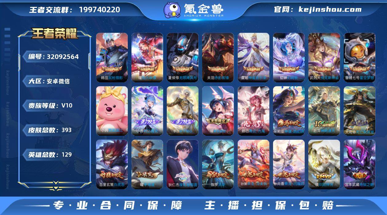 贵族等级:V10 典藏皮肤数:8 珍品无双皮肤数:0 无双皮肤数:4 珍品传说皮肤数:0 传说皮肤数:34 史诗皮肤数:126 皮肤数:393 英雄数:129 段位:荣耀王者