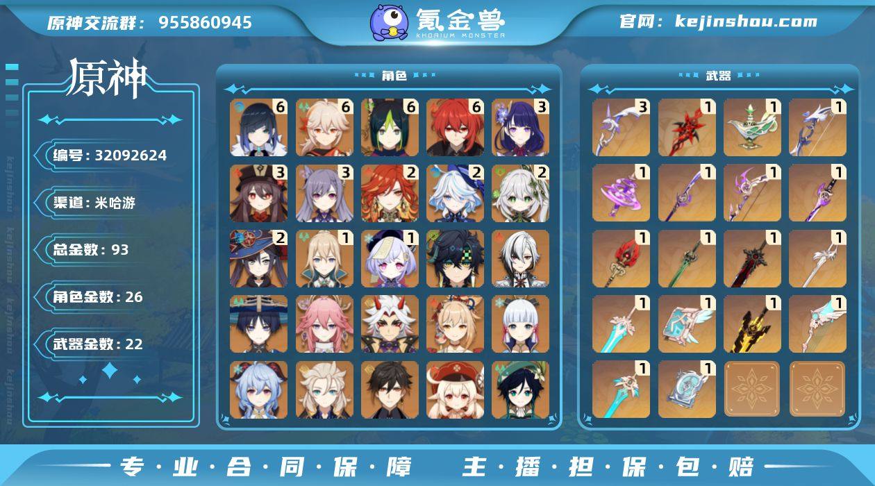 邮箱: 不送邮/死邮 总黄数: 93 冒险等级: 60 6命金色角色: 满命迪卢克,满命枫原万叶,满命夜兰,满命提纳里 3命金色角色: 三命刻晴,三命胡桃,三命雷电将军 2命金色角色: 二命莫娜,二命纳西妲,二命芙宁娜,二命玛薇卡 1命金色角色: 一命七七,一命琴 0命金色角色: 温迪,神里绫华,宵宫,可莉,钟离,阿贝多,甘雨,荒泷一斗,八重神子,流浪者,迪希雅,阿蕾奇诺,基尼奇 拥有武器: 狼的末路,天空之翼,雾切之回光,飞雷之弦振,四风原典,天空之卷,阿莫斯之弓,天空之傲,风鹰剑,天空之刃,无工之剑,磐岩结绿,护摩之杖,薙草之稻光,神乐之真意,若水,千夜浮梦,赤月之形 3精武器: 阿莫斯之弓 1精武器: 狼的末路,天空之翼,雾切之回光,飞雷之弦振,四风原典,天空之卷,天空之傲,风鹰剑,天空之刃,无工之剑,磐岩结绿,护摩之杖,薙草之稻光,神乐之真意,若水,千夜浮梦,赤月之形