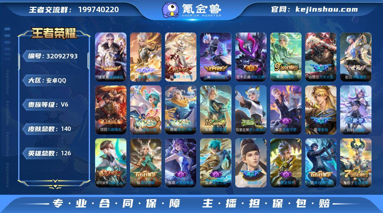 【4881】安卓Q-V6-至尊星耀V段位-126英雄-140皮肤-1典藏皮肤-1无双-6传说-35史诗 【英雄全皮】:孙权全皮 【荣耀典藏】:诸葛亮星域神启 【无双皮肤】:曜器灵螭龙剑 【传说皮肤】:澜愿照九州拓,桑启鸣野蒿,澜逐花归海,孙悟空齐天大圣,赵云淬星耀世,宫本武藏地狱之眼 【限定皮肤】:暃埋骨钱,姜子牙天穹之誓,李白谪仙醉月,狄仁杰阴阳师,赵云皇家上将,孙尚香蔷薇恋人,马可波罗山海玄木吟,狄仁杰魔术师,项羽海滩派对,孙悟空齐天大圣,李元芳云中旅人,鬼谷子五谷丰年,沈梦溪大漠名商,裴擒虎擒涛扼浪,鲁班大师探海日志,桑启海盐诗旅,张良古海寻踪,鬼谷子天穹祈灯,沈梦溪龙舞盛年,刘邦剑破天穹,刘备异域游侠,周瑜熔金海岸 【年限皮肤】:马可波罗山海玄木吟,澜愿照九州拓 【赛季限定】:沈梦溪大漠名商,李元芳云中旅人,桑启海盐诗旅,裴擒虎擒涛扼浪,鲁班大师探海日志,张良古海寻踪,鬼谷子天穹祈灯,刘邦剑破天穹,姜子牙天穹之誓,东皇太一噬灭天穹,太乙真人谧流熔炉,钟馗虚灵犬护,甄姬逆浪荇歌,亚瑟荣光之誓,项羽九幽镇关 【战令限定】:亚连破空之剑,周瑜线条小狗,小乔线条小狗 【史诗皮肤】:周瑜线条小狗,小乔线条小狗,项羽九幽镇关,女娲万灵启世,百里玄策罗小黑战记,黄忠百相守梦,阿轲化蝶舞,弈星万物之道,李白谪仙醉月,亚连破空之剑,暃埋骨钱,百里守约真我赫兹,马可波罗山海玄木吟,鬼谷子五谷丰年,澜赏金猎手,瑶遇见神鹿,狄仁杰鹰眼统帅,孙策猫狗日记,李元芳逐浪之夏,铠曙光守护者,诸葛亮黄金分割率,兰陵王暗隐猎兽者,小乔缤纷独角兽,夏侯惇乘风破浪,李白千年之狐,曹操幽灵船长,吕布圣诞狂欢,妲己女仆咖啡,妲己魅力维加斯,孙尚香水果甜心,孙尚香蔷薇恋人,宫本武藏鬼剑武藏,狄仁杰魔术师,甄姬冰雪圆舞曲,赵云未来纪元,赵云皇家上将...