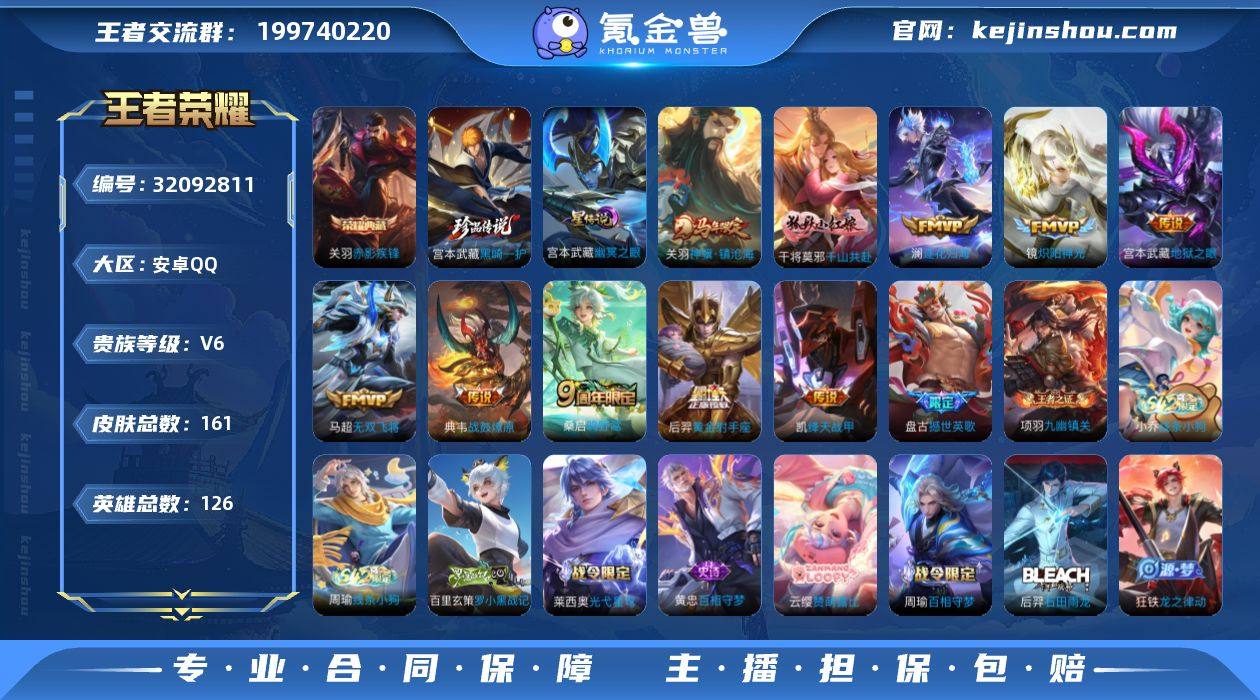 可换绑【精品特价号·关羽典藏·宫本珍品·马年关羽·至尊宝·多传说限定号】3045星币 15按键,1星传说,6王者印记,五级铭文50,可二次CD17941,安卓Q-V6-161皮肤-1典藏皮肤-1珍品传说-10传说-48史诗【英雄全皮】:孙权全皮,敖隐全皮,空空儿全皮【荣耀典藏】:关羽赤影疾锋【珍品传说】:宫本武藏黑崎一护【星元皮肤】:宫本武藏幽冥之眼【传说皮肤】:关羽神骥镇沧海,干将莫邪千山共赴,桑启鸣野蒿,典韦战鼓燎原,澜逐花归海,马超无双飞将,铠绛天战甲,镜炽阳神光,后羿黄金射手座,宫本武藏地狱之眼【限定皮肤】:狄仁杰阴阳师,赵云皇家上将,元歌无心,狄仁杰魔术师,项羽海滩派对,孙悟空至尊宝,百里玄策原初追逐者,裴擒虎李小龙,司空震地狱燃心,姬小满妄想食味,沈梦溪龙舞盛年【赛季限定】:东皇太一噬灭天穹,太乙真人谧流熔炉,钟馗虚灵犬护,甄姬逆浪荇歌,亚瑟荣光之誓,百里玄策原初追逐者,项羽九幽镇关【战令限定】:司空震地狱燃心,刘禅鸭鸭历险记,沈梦溪鸭鸭历险记,周瑜百相守梦,孙策百相守梦,莱西奥光弋星穹,明世隐往忆晖光,周瑜线条小狗,小乔线条小狗【史诗皮肤】:盘古撼世英歌,周瑜线条小狗,小乔线条小狗,项羽九幽镇关,百里玄策罗小黑战记,莱西奥光弋星穹,黄忠百相守梦,云缨赞萌露比,周瑜百相守梦,后羿石田雨龙,狂铁龙之律动,刘禅鸭鸭历险记,阿轲化蝶舞,马可波罗星界特工,姬小满妄想食味,司空震地狱燃心,元歌无心,澜赏金猎手,钟馗乐园奇幻夜,杨戬天秀启明,百里玄策热力回旋,裴擒虎李小龙,百里玄策原初追逐者,狄仁杰鹰眼统帅,伽罗箭羽风息,白起星夜王子,程咬金功夫厨神,蔡文姬舞动绿茵,铠曙光守护者,雅典娜冰冠公主,亚瑟心灵战警,诸葛亮黄金分割率,兰陵王暗隐猎兽者,刘邦德古拉伯爵,花木兰水晶猎龙者,孙悟空至尊宝,张飞乱世虎臣,吕布末日...