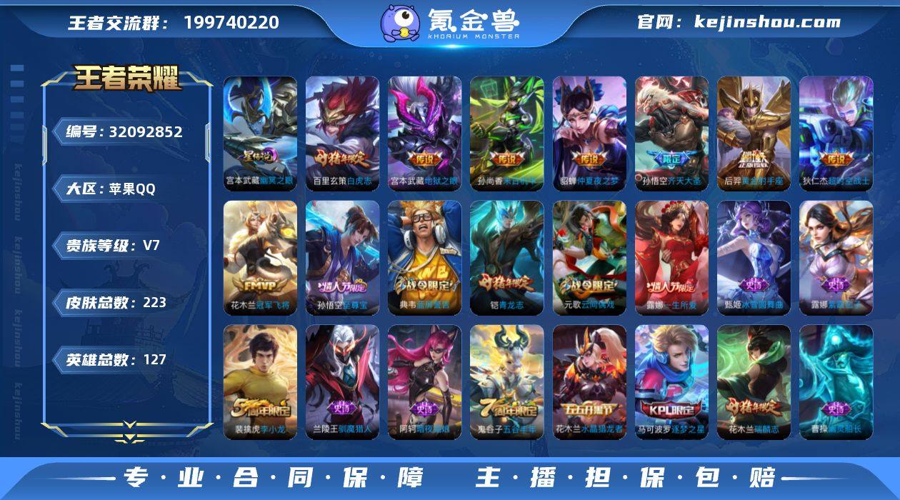 V7 8传说 1星元 223皮肤 127英雄 【8传说】孙悟空-齐天大圣,百里玄策-白虎志,狄仁杰-超时空战士,貂蝉-仲夏夜之梦,宫本武藏-地狱之眼,后羿-黄金射手座,花木兰-冠军飞将,孙尚香-末日机甲【1星元】宫本武藏-幽冥之眼【47史诗】鬼谷子-五谷丰年,阿轲-暗夜猫娘,阿轲-节奏热浪,安琪拉-心灵骇客,百里守约-特工魅影,百里玄策-热力回旋,蔡文姬-舞动绿茵,曹操-幽灵船长,程咬金-功夫厨神,妲己-魅力维加斯,狄仁杰-魔术师,狄仁杰-鹰眼统帅,典韦-蓝屏警告,貂蝉-圣诞恋歌,东皇太一-逐梦之光,宫本武藏-鬼剑武藏,花木兰-水晶猎龙者,花木兰-瑞麟志,铠-青龙志,兰陵王-暗隐猎兽者,兰陵王-驯魔猎人,李白-千年之狐,廉颇-地狱岩魂,刘禅-绅士熊喵,露娜-紫霞仙子,露娜-一生所爱,鲁班七号-狮舞东方,吕布-圣诞狂欢,马可波罗-逐梦之星,上官婉儿-梁祝,裴擒虎-李小龙,孙策-猫狗日记,孙尚香-水果甜心,孙悟空-至尊宝,王昭君-偶像歌手,雅典娜-黎明之约,亚瑟-心灵战警,杨玉环-遇见飞天,嬴政-摇滚巨星,嬴政-优雅恋人,嬴政-白昼王子,元歌-云间偶戏,赵云-皇家上将,甄姬-冰雪圆舞曲,甄姬-游园惊梦,诸葛亮-黄金分割率,梦奇-顽趣