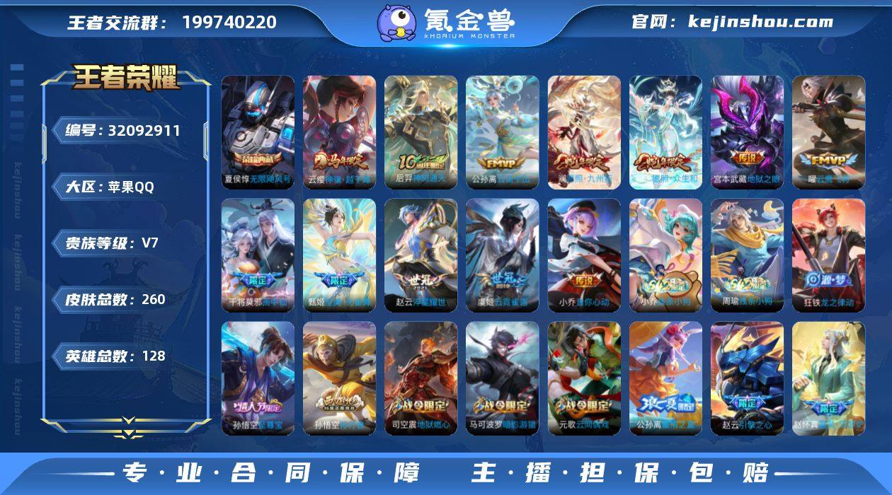 贵族7-贵族积分28833-260皮1典藏12传说-2个英雄全皮 苹果手Q124区260皮1典藏12传说0无双V7 营地ID2143126277最强王者【荣耀典藏】:无限飓风号【优质限定皮肤】:至尊宝【传说皮肤】:神骥·越千峰,地狱之眼,神树通天,云诺千山,愿照·九州拓,愿照·众生和,画中仙,至美·化雀舞,淬星耀世,云鹰飞将,音你心动,云霓雀翎【史诗皮肤】:节奏热浪,舞动绿茵,线条小狗,龙之律动,无心,荣光圣徽,幽灵船长,特工魅影,德古拉伯爵,心灵战警,曙光守护者,器灵·浮梦炉,遇见飞天,原初追逐者,孙行者,鬼剑武藏,女仆咖啡,水果甜心,电玩小子,乘风破浪,圣诞狂欢,乱世虎臣,千年之狐,拒霜思,至尊宝,百解令,逐浪之夏,纤云弄巧,梁祝,真爱魔法,五谷丰年,江河有灵,游园惊梦,黎明之约,冰冠公主,狂想玩偶喵,胡桃异想国,暗影游猎,奇幻香踪,高山流水,航海奇遇记,云间偶戏,李小龙,皇家上将,地狱燃心,魅力维加斯,蔷薇恋人,魔术师,鹰眼统帅,末日机甲,地狱岩魂,冰雪圆舞曲,魅语,驭风魔法,引擎之心,黄金分割率,缤纷独角兽,蜜橘之夏,金属风暴,功夫厨神,星夜王子,摇滚巨星,暗隐猎兽者,电玩·爆裂旋风,水晶猎龙者