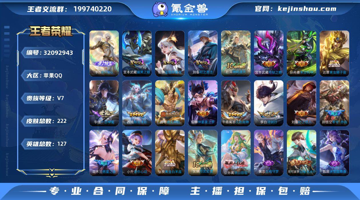 V7 1无双 15传说 3星元 222皮肤 127英雄 【1无双】李白-碎月剑心【15传说】李白-诗剑行,达摩-黄金狮子座,貂蝉-仲夏夜之梦,干将莫邪-久胜战神,宫本武藏-地狱之眼,李信-一念神魔,刘备-时之恋人,孙尚香-末日机甲,孙悟空-零号·赤焰,西施-游龙清影,小乔-音你心动,张良-黄金白羊座,花木兰-燃星之曲,吕布-遇见神鼓,后羿-神树通天【3星元】刘备-时之思念,宫本武藏-幽冥之眼,貂蝉-金色仲夏夜之梦【56史诗】元歌-无心,鬼谷子-五谷丰年,赵云-未来纪元,钟无艳-超时空战士,夏洛特-永昼,阿轲-暗夜猫娘,阿轲-节奏热浪,安琪拉-心灵骇客,白起-星夜王子,百里守约-特工魅影,蔡文姬-舞动绿茵,曹操-幽灵船长,程咬金-功夫厨神,妲己-女仆咖啡,大乔-猫狗日记,狄仁杰-魔术师,狄仁杰-鹰眼统帅,貂蝉-圣诞恋歌,宫本武藏-鬼剑武藏,花木兰-水晶猎龙者,铠-曙光守护者,兰陵王-暗隐猎兽者,李白-千年之狐,李元芳-逐浪之夏,廉颇-地狱岩魂,刘邦-德古拉伯爵,刘禅-绅士熊喵,露娜-紫霞仙子,吕布-圣诞狂欢,吕布-末日机甲,墨子-金属风暴,上官婉儿-梁祝,孙策-猫狗日记,孙尚香-水果甜心,夏侯惇-乘风破浪,项羽-苍穹之光,小乔-缤纷独角兽,小乔-青蛇,亚瑟-心灵战警,嬴政-摇滚巨星,云中君-纤云弄巧,张飞-乱世虎臣,赵云-皇家上将,甄姬-冰雪圆舞曲,诸葛亮-黄金分割率,扁鹊-奇幻香踪,戈娅-驭风魔法,刘禅-电玩·爆裂旋风,鲁班七号-蔬乡物语,马可波罗-山海·玄木吟,蒙犽-百解令,蒙恬-荣光圣徽,伽罗-琥珀纪元,黄忠-百相守梦,公孙离-涂山容容,女娲-万灵启世