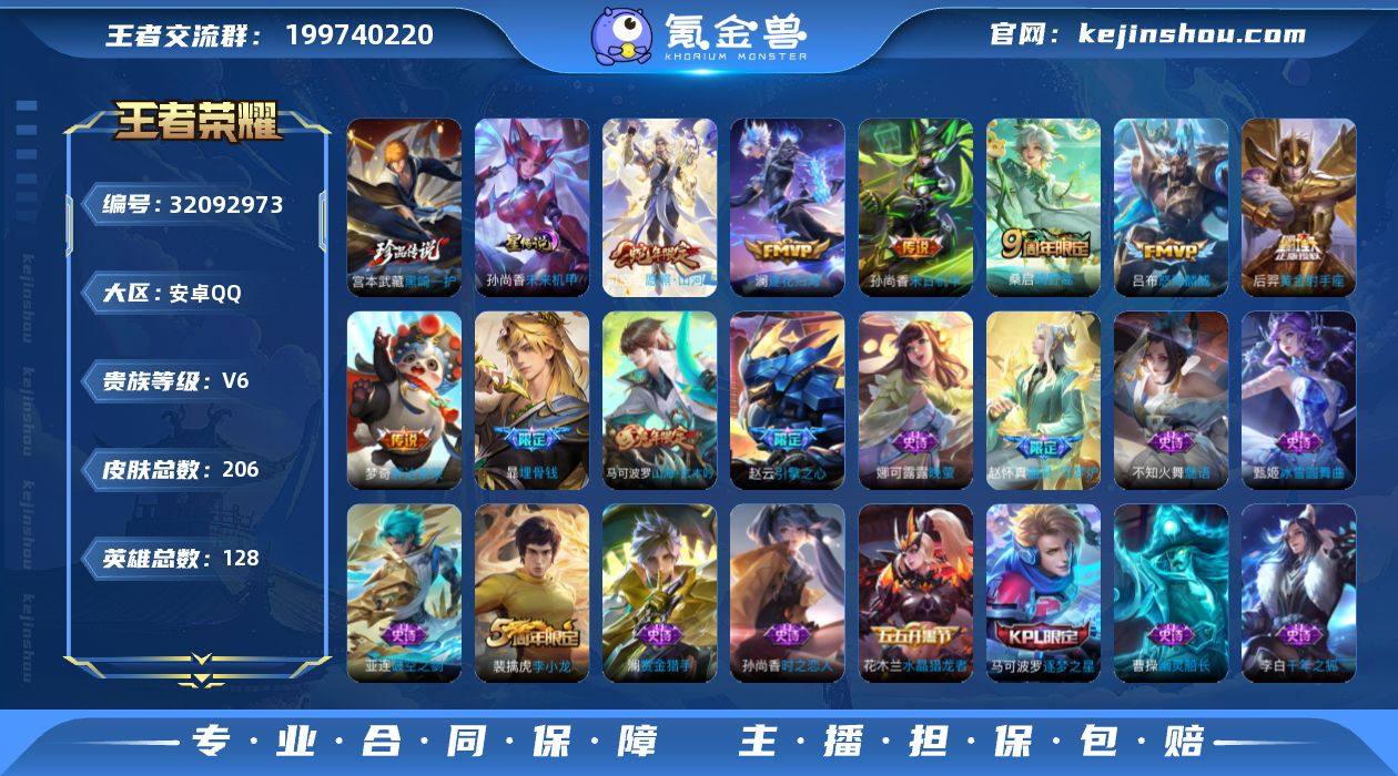 V6 1珍品 7传说 1星元 206皮肤 128英雄 【1珍品传说】宫本武藏-黑崎一护【7传说】后羿-黄金射手座,梦奇-胖达荣荣,孙尚香-末日机甲,吕布-怒海麟威,澜-逐花归海,桑启-鸣野蒿,司空震-愿照·山河定【1星元】孙尚香-未来机甲【43史诗】澜-赏金猎手,阿轲-节奏热浪,百里守约-特工魅影,百里玄策-原初追逐者,百里玄策-热力回旋,不知火舞-魅语,曹操-幽灵船长,大乔-猫狗日记,狄仁杰-魔术师,狄仁杰-鹰眼统帅,宫本武藏-鬼剑武藏,花木兰-水晶猎龙者,兰陵王-暗隐猎兽者,李白-千年之狐,李元芳-银河之约,刘邦-德古拉伯爵,马可波罗-逐梦之星,墨子-金属风暴,娜可露露-晚萤,裴擒虎-李小龙,孙策-猫狗日记,孙尚香-水果甜心,孙尚香-时之恋人,王昭君-偶像歌手,夏侯惇-乘风破浪,雅典娜-黎明之约,亚瑟-心灵战警,杨戬-天秀·启明,嬴政-摇滚巨星,张飞-乱世虎臣,赵云-皇家上将,赵云-引擎之心,甄姬-冰雪圆舞曲,甄姬-游园惊梦,钟无艳-王者之锤,梦奇-顽趣,鲁班七号-蔬乡物语,马可波罗-山海·玄木吟,亚连-破空之剑,暃-埋骨钱,赵怀真-器灵·浮梦炉,牛魔-星界战将,蒙犽-顽岩魄