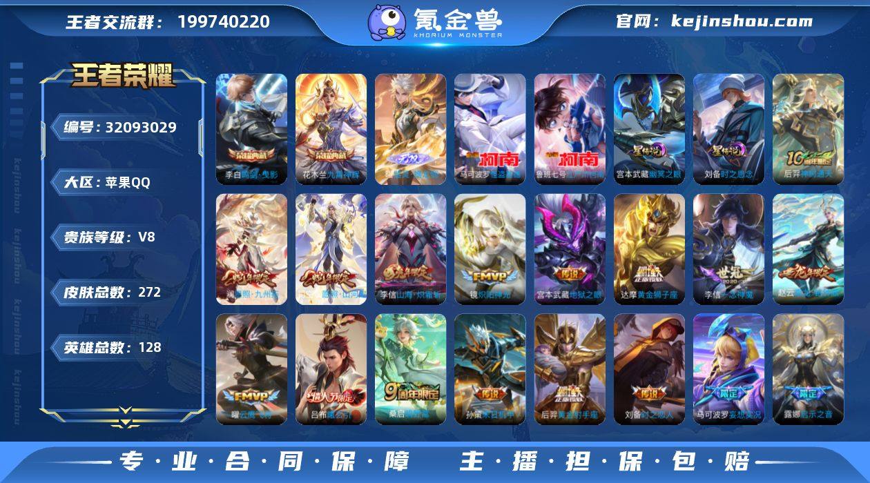 V8 2典藏 1无双 2珍品 21传说 2星元 272皮肤 128英雄 【2水晶】花木兰-九霄神辉,李白-鸣剑·曳影【1无双】曜-器灵·螭龙剑【2珍品传说】马可波罗-怪盗基德,鲁班七号-江户川柯南【21传说】李信-山海·炽霜斩,达摩-黄金狮子座,宫本武藏-地狱之眼,后羿-黄金射手座,镜-炽阳神光,李信-一念神魔,刘备-时之恋人,梦奇-胖达荣荣,孙策-末日机甲,小乔-音你心动,虞姬-启明星使,马可波罗-妄想实况,赵云-乘龙·铭钟鼎,吕布-曦玄引,露娜-启示之音,曜-云鹰飞将,桑启-鸣野蒿,司空震-愿照·山河定,澜-愿照·九州拓,后羿-神树通天【2星元】刘备-时之思念,宫本武藏-幽冥之眼【60史诗】元歌-无心,上官婉儿-神器·万象笔,赵云-未来纪元,阿轲-暗夜猫娘,阿轲-节奏热浪,阿轲-迷踪丽影,安琪拉-魔法小厨娘,安琪拉-心灵骇客,白起-星夜王子,百里守约-特工魅影,百里玄策-原初追逐者,百里玄策-热力回旋,曹操-幽灵船长,程咬金-功夫厨神,大乔-猫狗日记,大乔-白蛇,狄仁杰-魔术师,狄仁杰-鹰眼统帅,貂蝉-圣诞恋歌,宫本武藏-鬼剑武藏,韩信-白龙吟,韩信-飞衡,花木兰-水晶猎龙者,橘右京-修罗,铠-曙光守护者,兰陵王-暗隐猎兽者,李白-千年之狐,李元芳-逐浪之夏,廉颇-地狱岩魂,刘禅-绅士熊喵,露娜-紫霞仙子,吕布-圣诞狂欢,墨子-金属风暴,芈月-白晶晶,娜可露露-晚萤,裴擒虎-李小龙,沈梦溪-月团寄思,司马懿-暗渊魔法,孙尚香-水果甜心,孙悟空-至尊宝,孙悟空-孙行者,王昭君-偶像歌手,夏侯惇-乘风破浪,小乔-缤纷独角兽,小乔-青蛇,雅典娜-冰冠公主,亚瑟-心灵战警,杨戬-天秀·启明,嬴政-摇滚巨星,元歌-云间偶戏,张飞-乱世虎臣,赵云-皇家上将,甄姬-冰雪圆舞曲,钟馗-乐园奇幻夜,庄周-高山流水,刘备-百相守梦,暃-星界游侠,戈娅-驭风魔法,蒙恬-荣光圣徽,弈星-万物之道